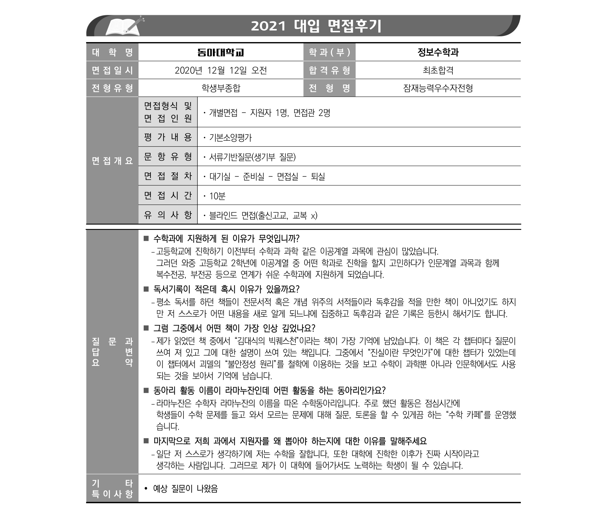 2021학년도 동아대학교 면접 후기44 - 전자공학과 2021학년도 동아대학교 면접 후기45 - 정보수학과