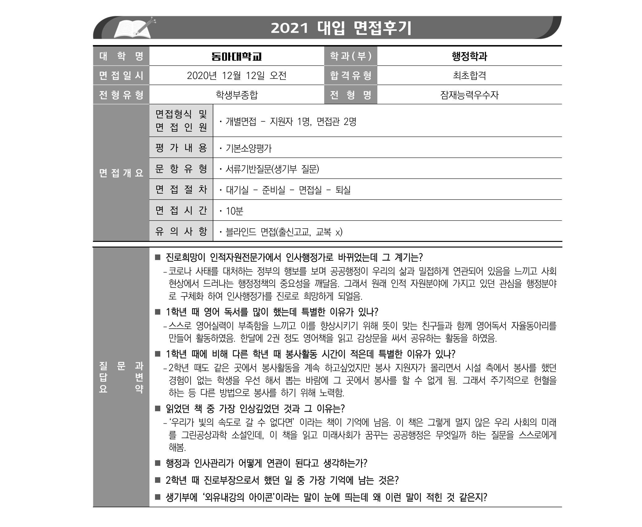 2021학년도 동아대학교 면접 후기58 - 행정학과