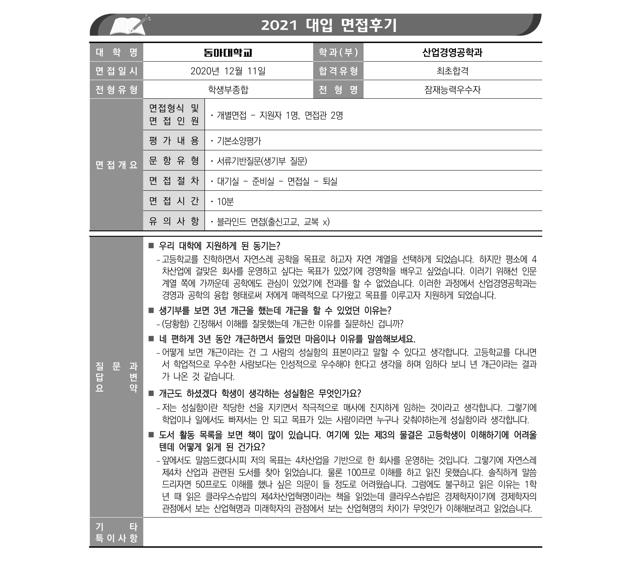 2021학년도 동아대학교 면접 후기26 - 산업경영공학과 2021학년도 동아대학교 면접 후기27 - 산업경영공학과