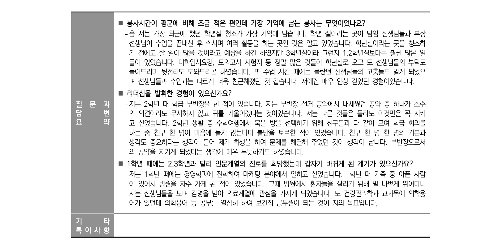 · 학교생활기록부에 보면 학생회나 학급에서 임원을 한 경험을 볼 수 있는데요, 본인의 역할사례나 리더십 실천사례가 있다면 말해보세요.