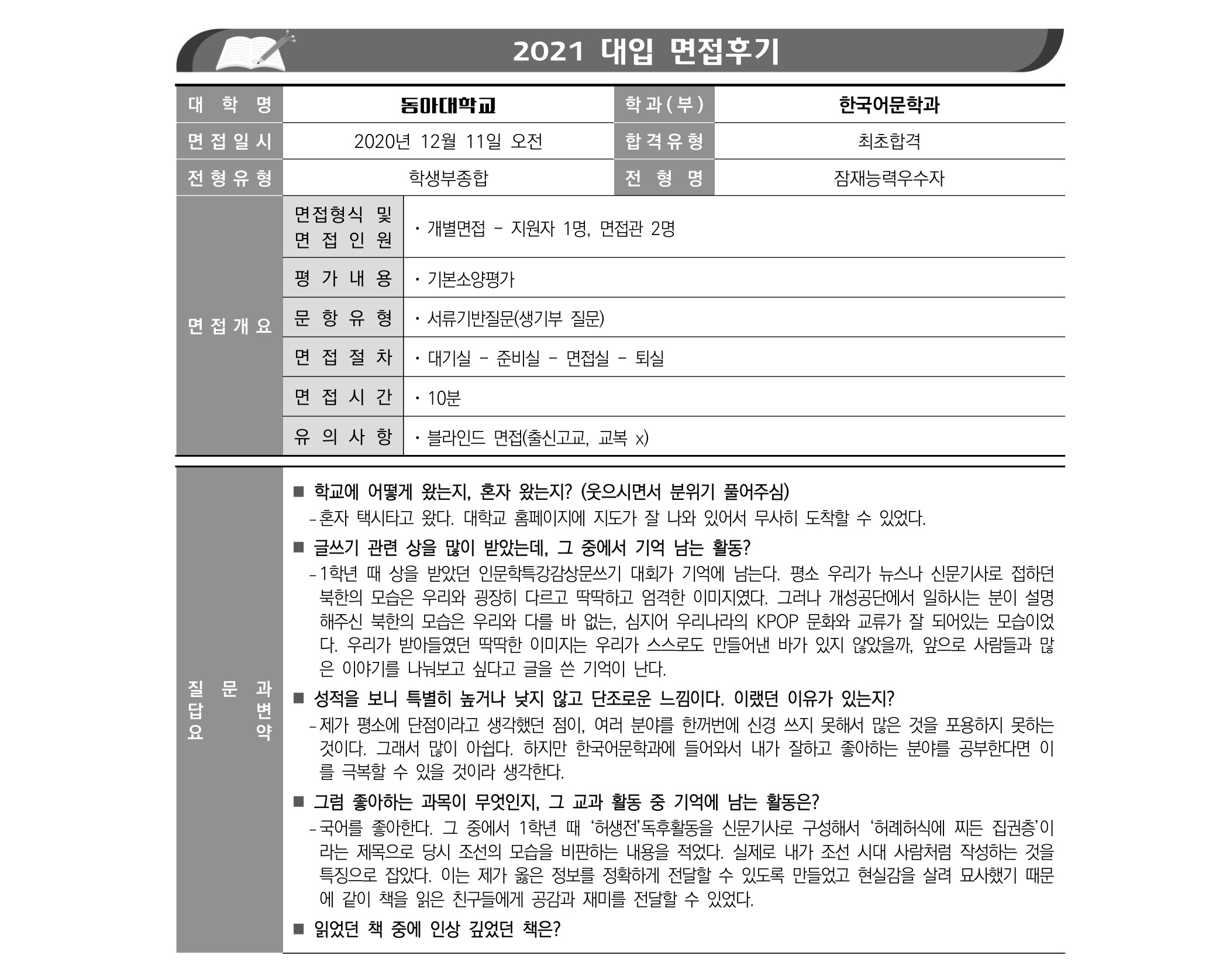 2021학년도 동아대학교 면접 후기57 - 한국어문학과