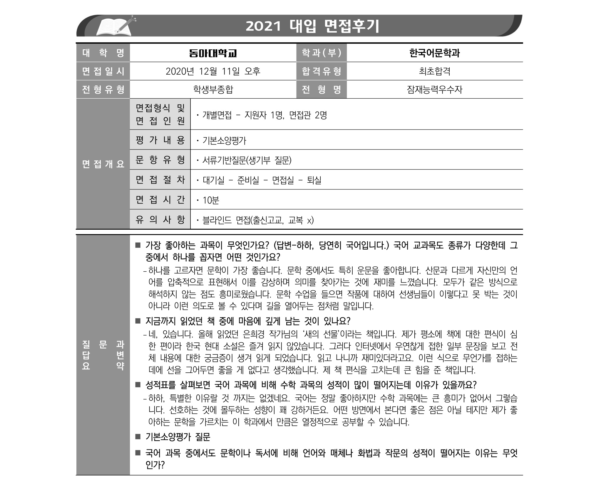 2021학년도 동아대학교 면접 후기56 - 한국어문학과