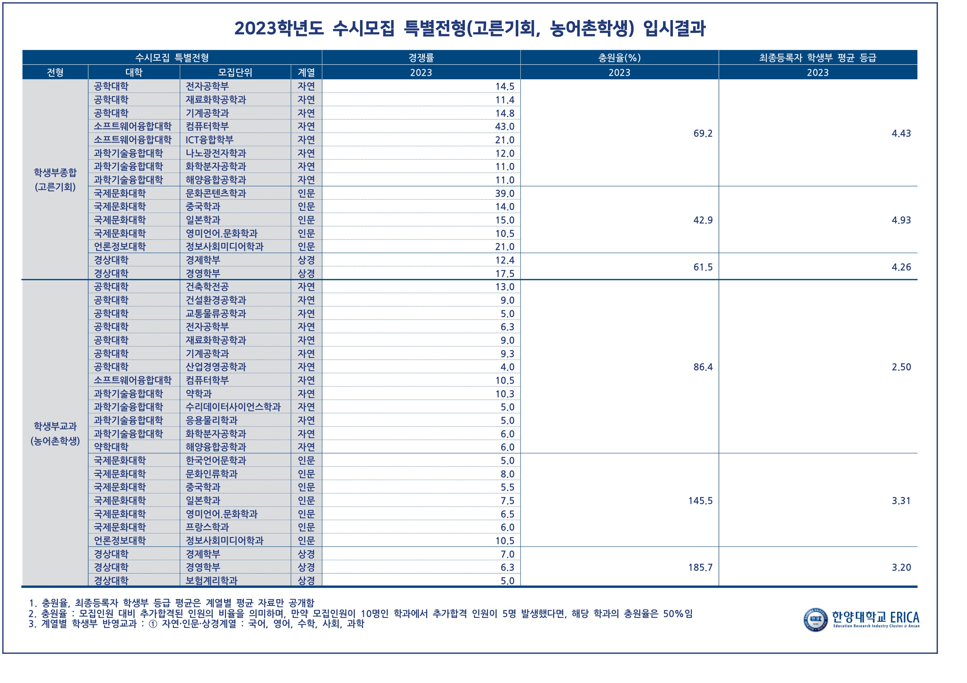 2023학년도 한양대학교 에리카 특별전형(고른기회, 농어촌학생) 수시등급 2023학년도 한양대학교 에리카 주요 전형 선발 현황