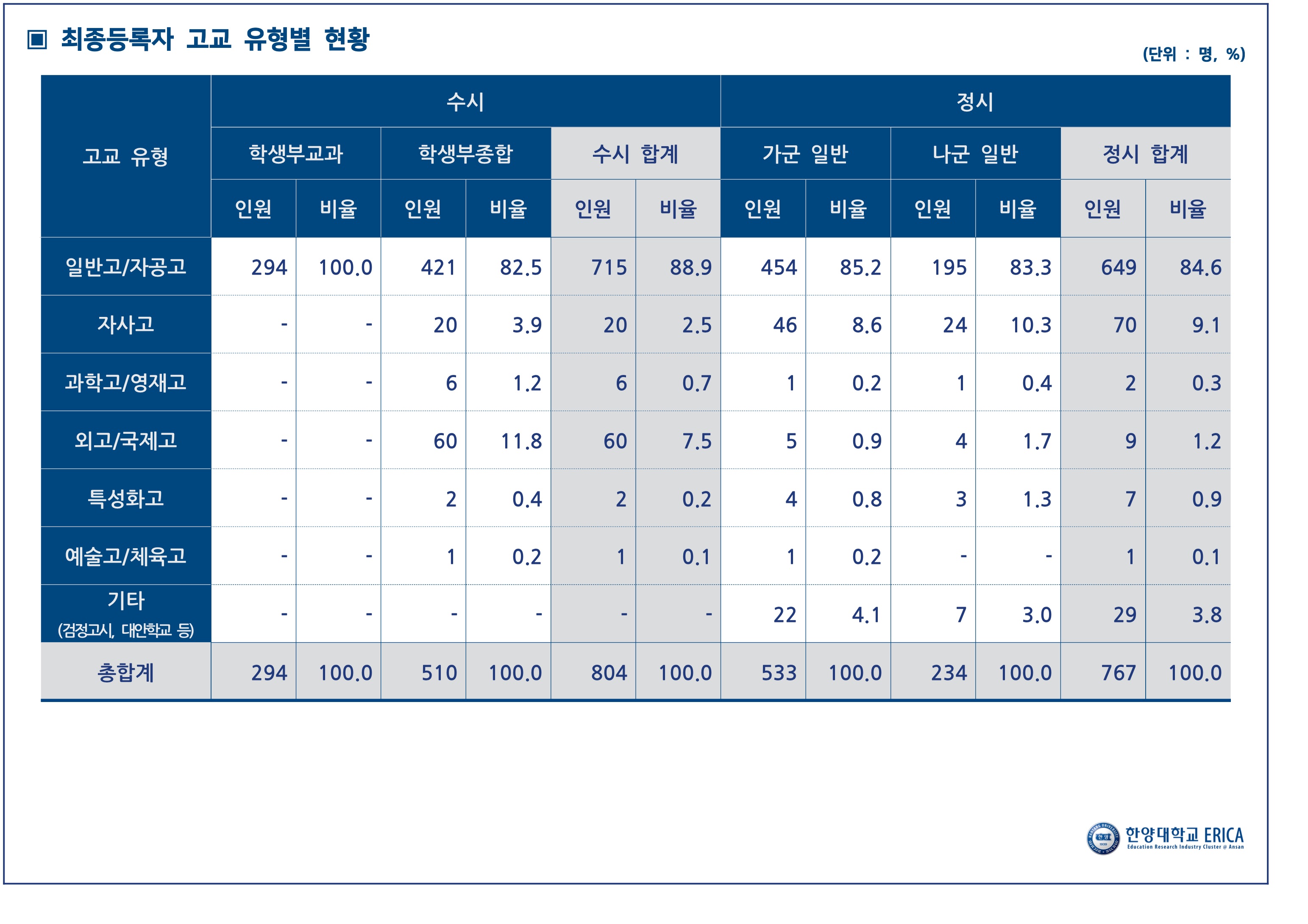 2023학년도 한양대학교 에리카 주요 전형 선발 현황