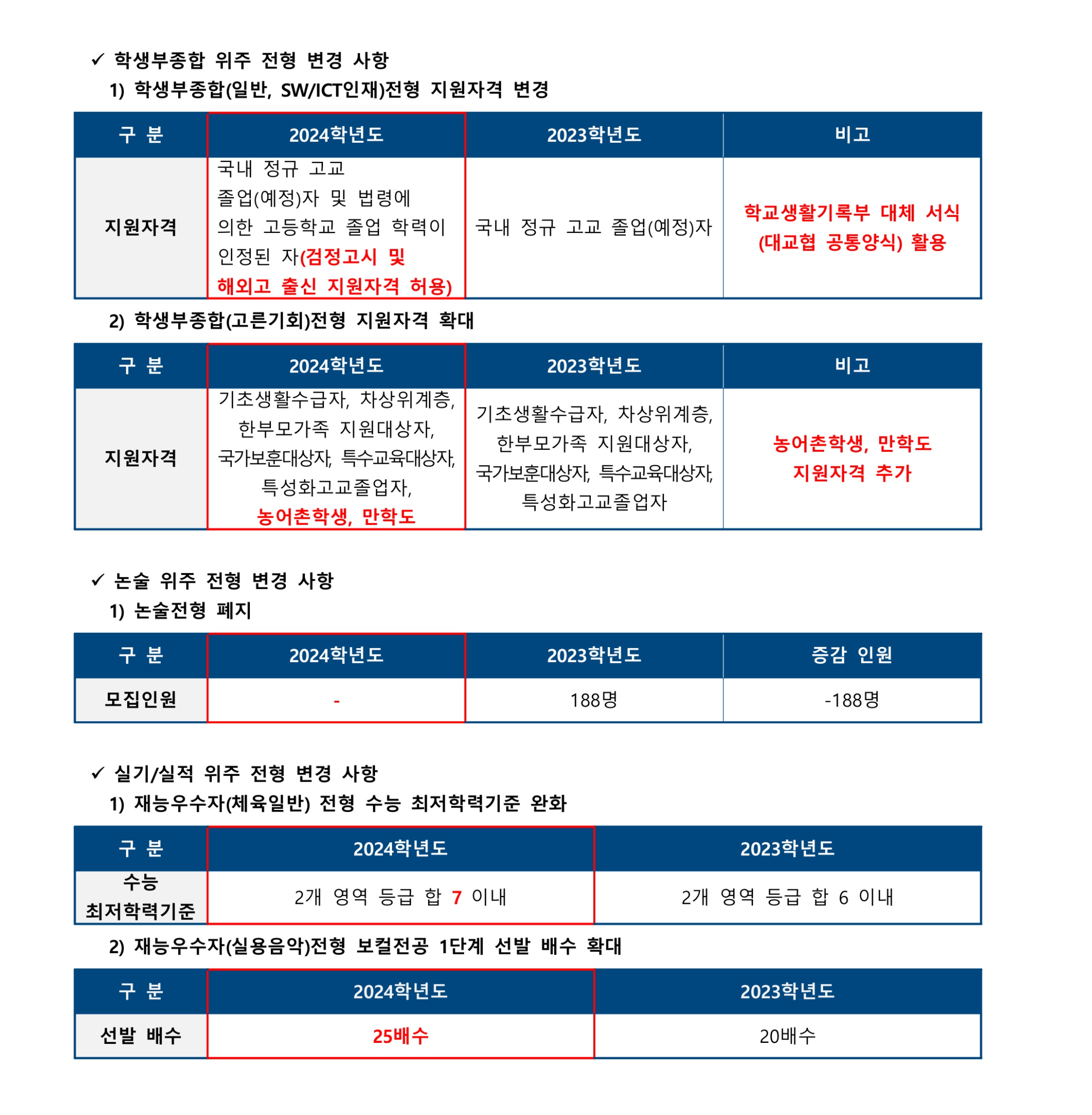 2024학년도 한양대학교 에리카 수시모집 주요 변경 사항 2024학년도 한양대학교 에리카 수시모집 전형방법 요약