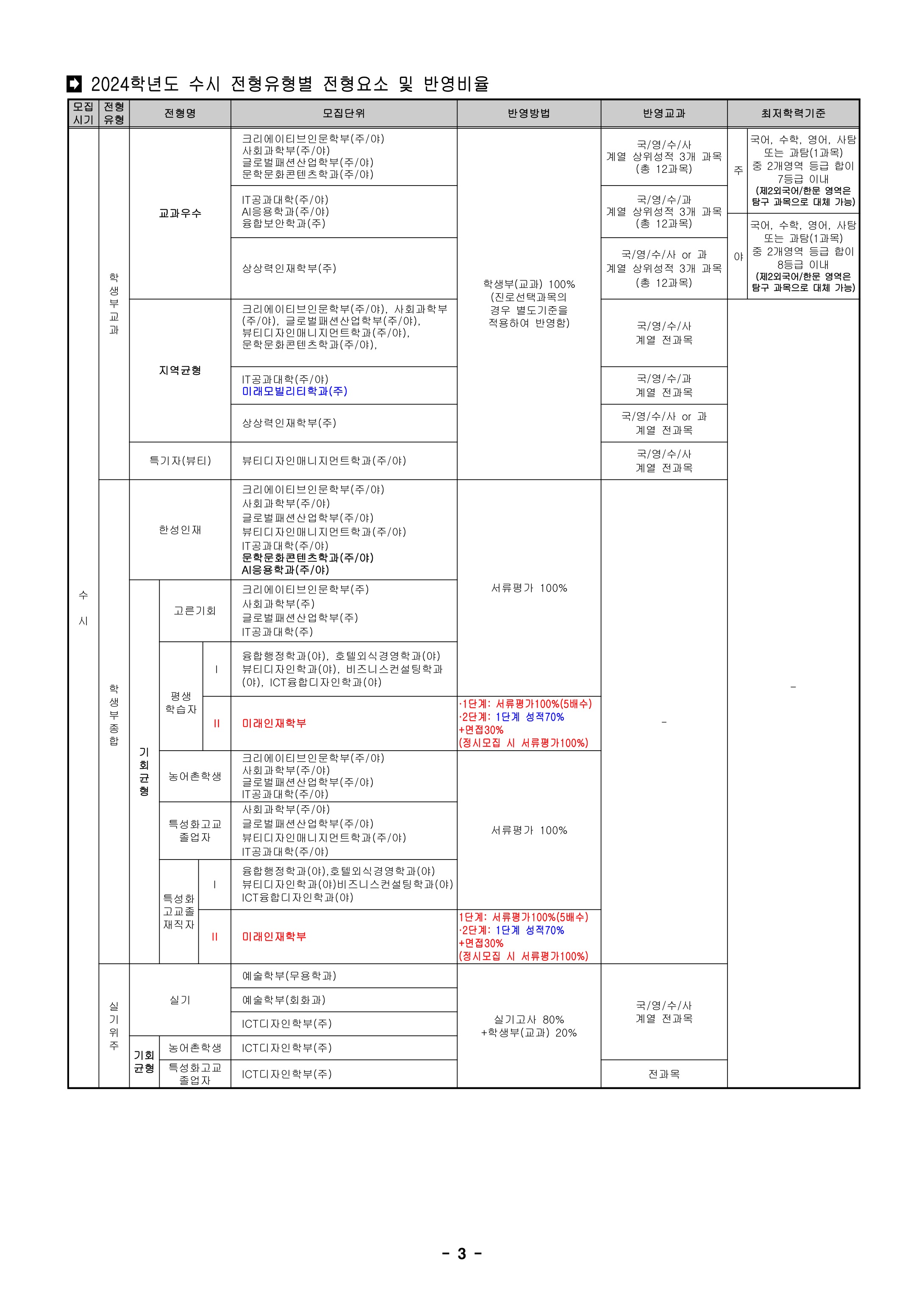 2024학년도 한성대학교 수시모집 전형요약 및 주요 변경사항 2024학년도 수시 전형유형별 전형요소 및 반영비율