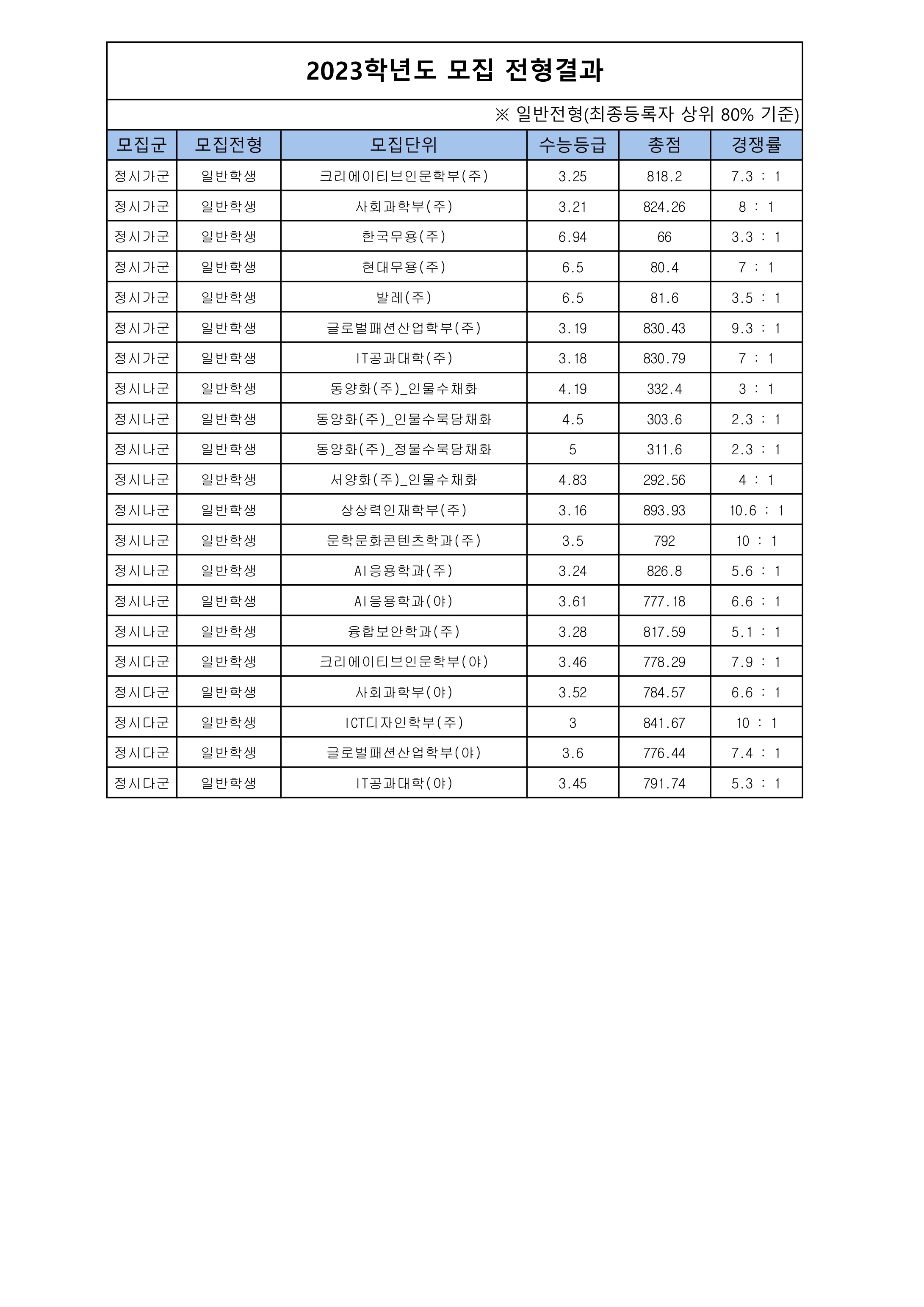 (수능)가군 크리에이티브인문학부(주) 21 7.38 29 811.00 1,000 75.33 사회과학부(주) 25 8.04 37 819.50 1,000 76.67 글로벌패션산업학부(주) 10 9.30 8 822.50 1,000 77.00 IT공과대학(주) 55 7.02 76 822.00 1,000 77.00 나군 상상력인재학부(주) 65 10.60 34 888.00 1,000 74.67 AI응용학과(주) 45 5.62 65 810.00 1,000 75.33 AI응용학과(야) 27 6.59 45 770.00 1,000 71.67 융합보안학과(주) 30 5.10 37 812.00 1,000 76.00 다군 크리에이티브인문학부(야) 17 7.88 5 770.50 1,000 72.67 사회과학부(야) 30 6.63 11 773.50 1,000 72.33 글로벌패션산업학부(야) 12 7.42 0 771.50 1,000 71.67 ICT디자인학부(주) 4 10.00 7 846.50 1,000 78.33 IT공과대학(야) 40 5.28 15 783.50 1,000 72.67 ※ 탐구: 반영과목 1과목