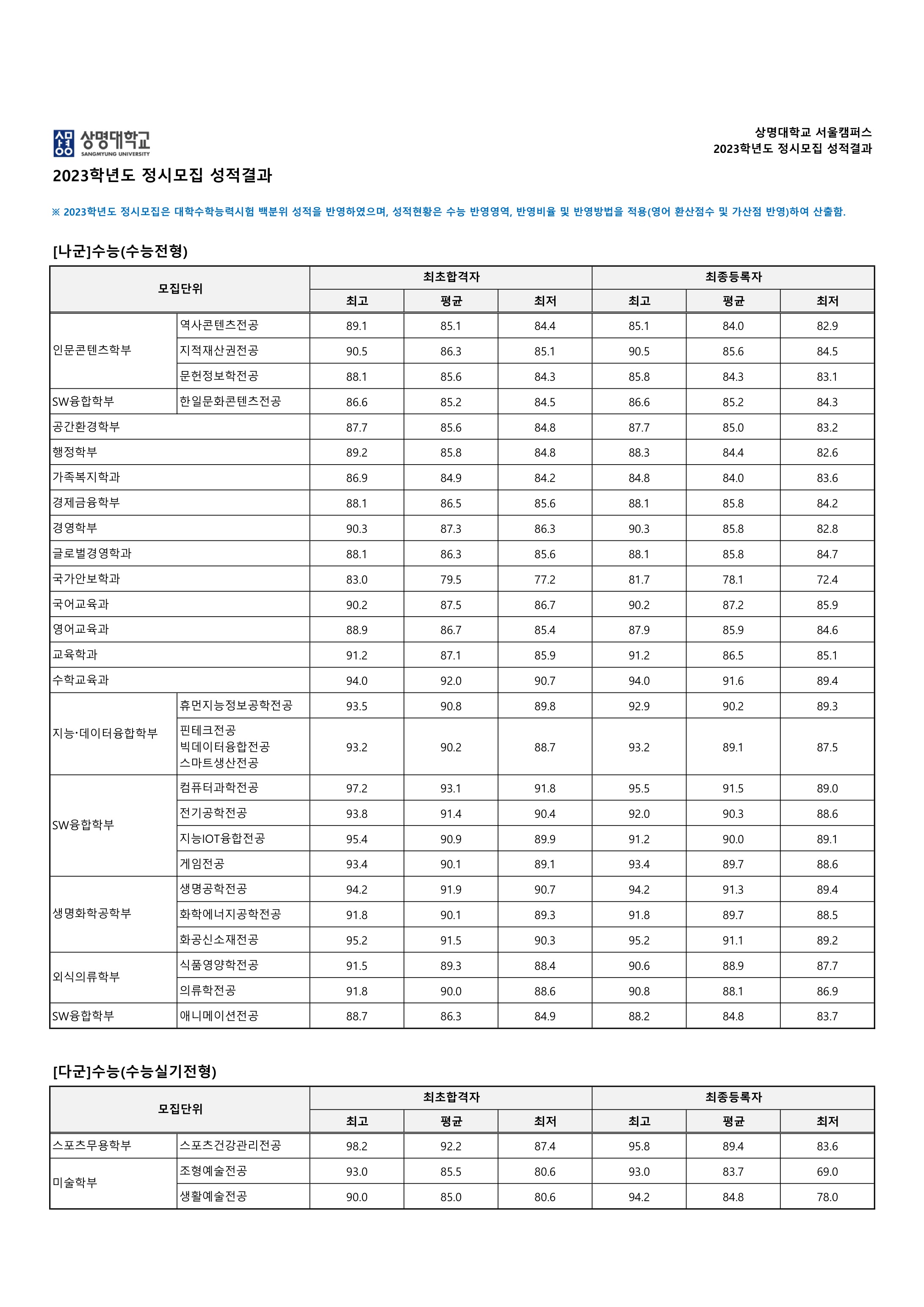 2023학년도 상명대학교 정시등급 횐님들 안녕하세영! 오늘은 2023학년도 상명대학교 정시등급에 대해서 알아보도록 해영. 올해 상명대 서울캠퍼스에서는 나군과 다군에서 정시모집을 하고영, 다군의 수능실기전형을 제외하고는 모두 수능 100%로 모집해영. 지원하는 계열마다 수능 과목의 반영 비율이 다르니 지원 전에 확인해 보세영. 또 올해부터 국가안보학과와 스포츠건강관리전공의 전형 방법이 바뀌었어영. 자세한 사항은 아래 2024학년도 상명대학교 정시모집 요강을 읽어보시면 알 수 있어영. 상명대 최종등록자의 대학별 환산점수를 확인하실 횐님들은 맨 아래 표도 참고해 보세영.🌟
