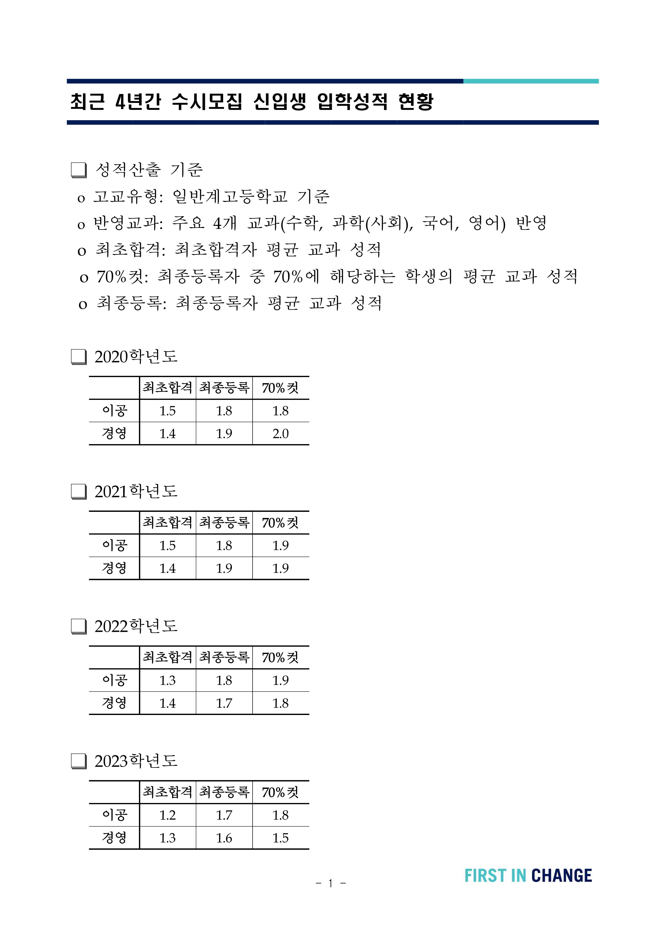 2023학년도 UNIST 학부 신입생 모집 결과 2020학년도~2023학년도 UNIST 수시모집 신입생 입학성적 현황