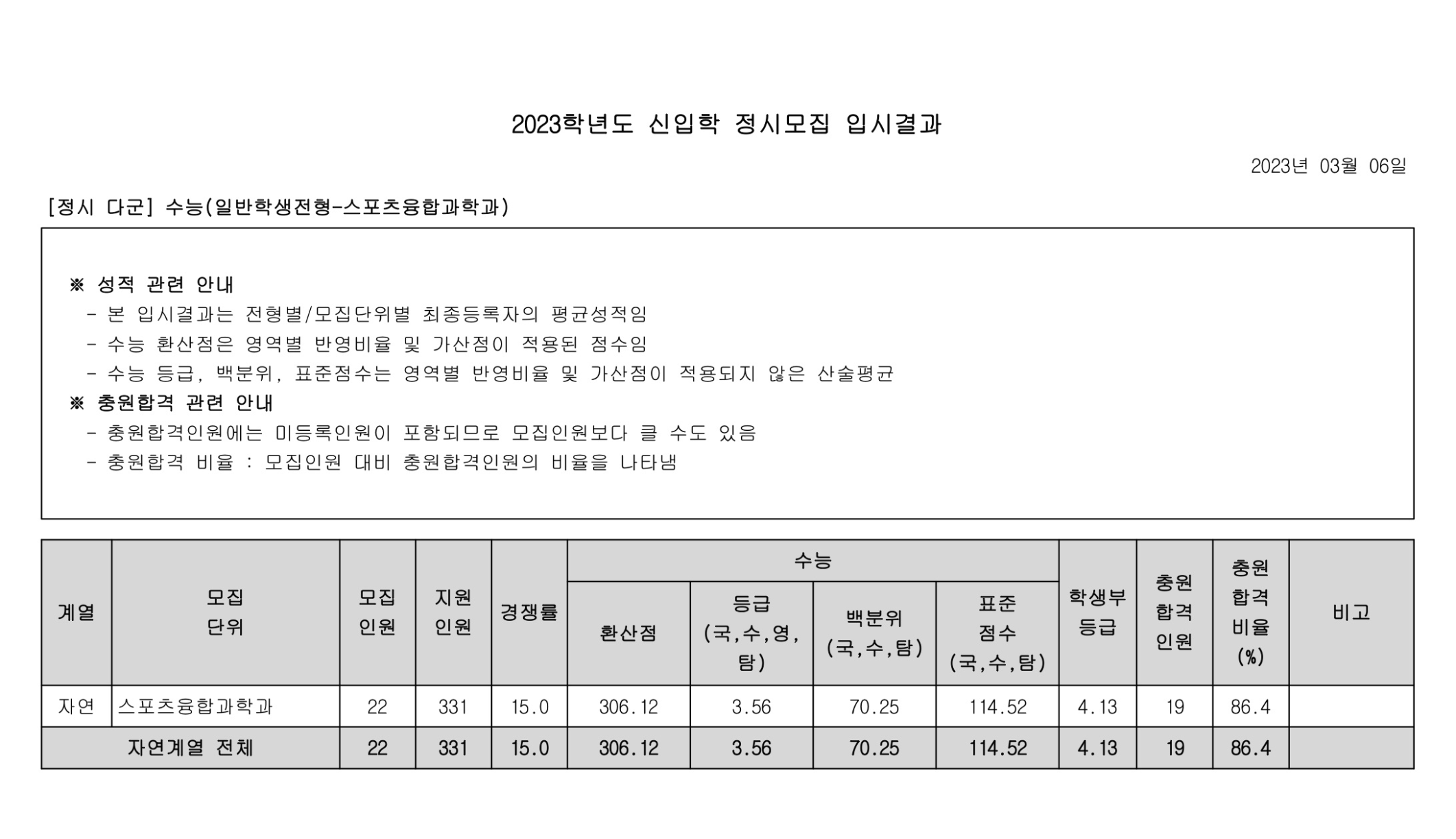 2023학년도 광운대학교 정시 다군 수능(일반학생전형) 정시등급 2023학년도 광운대학교 정시 다군 수능(일반학생전형-스포츠융합과학과) 정시등급
