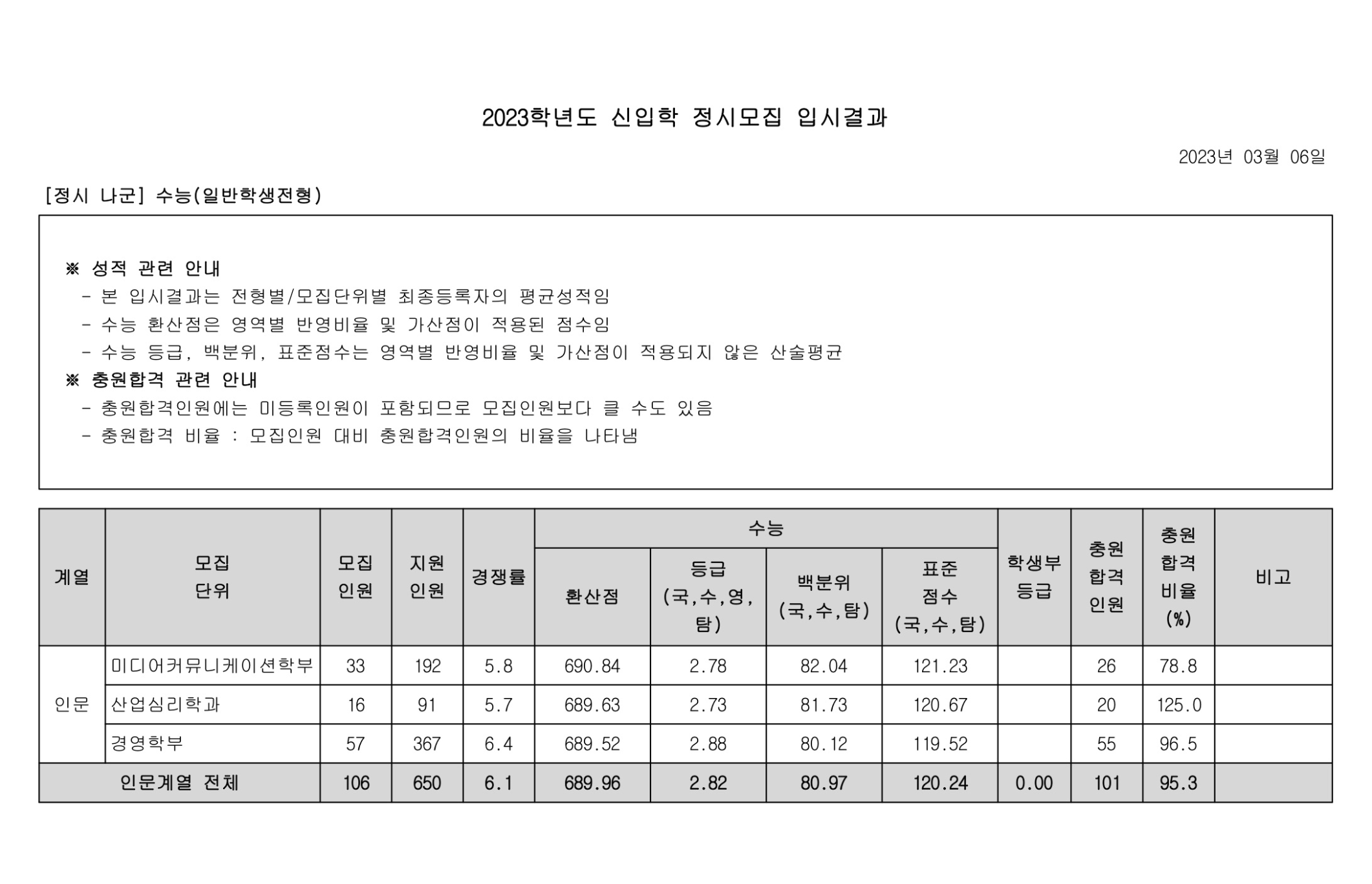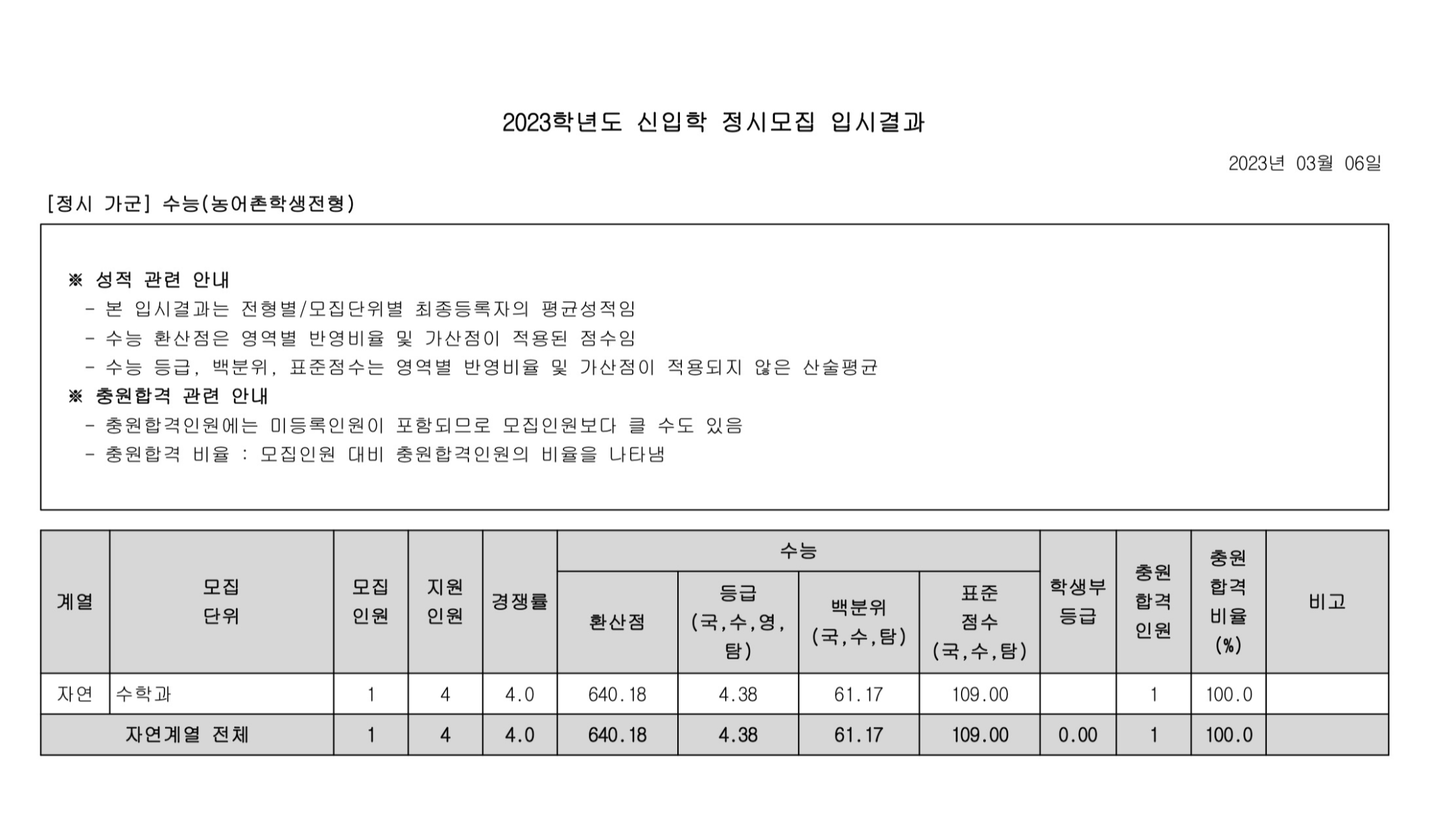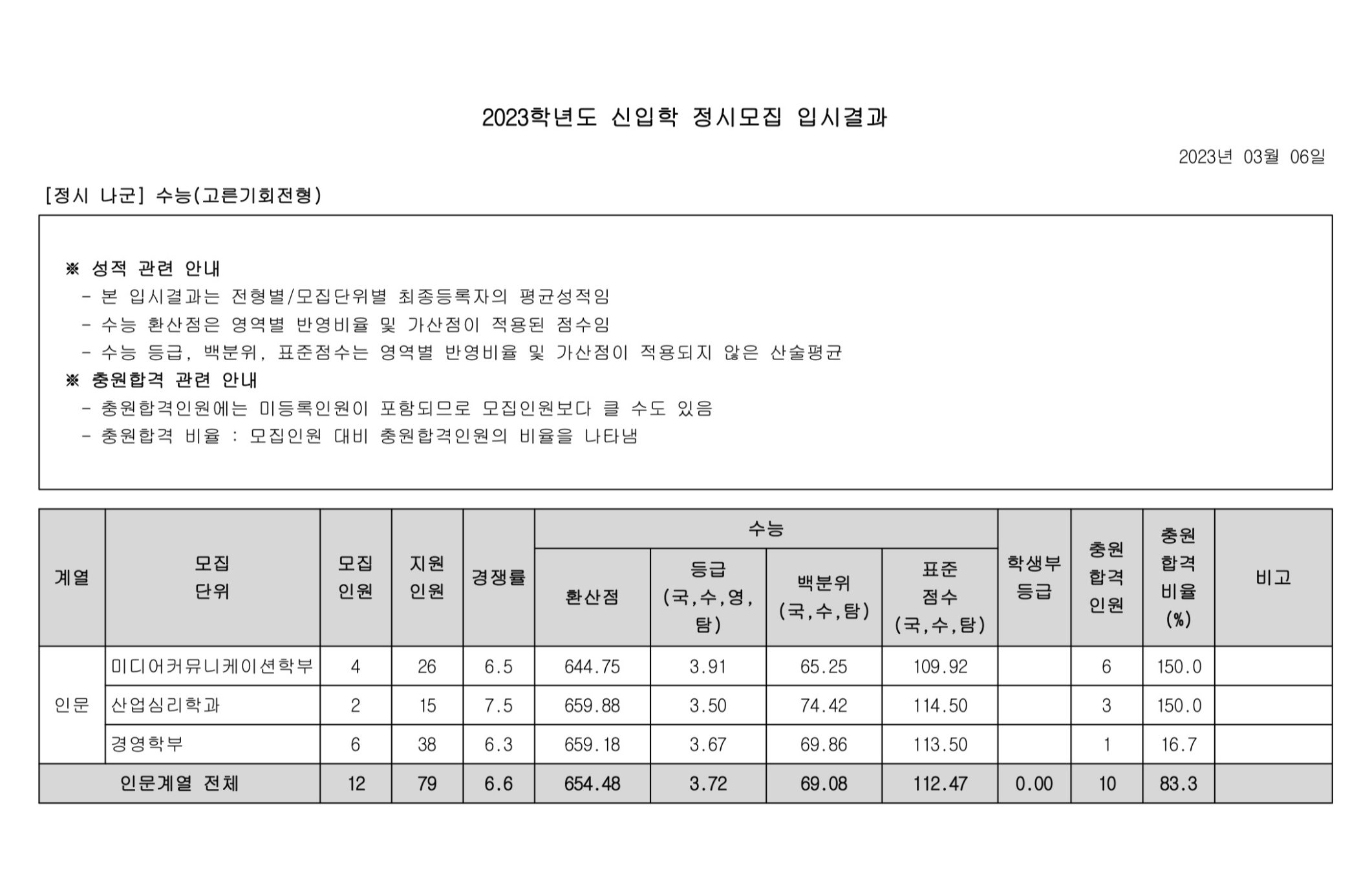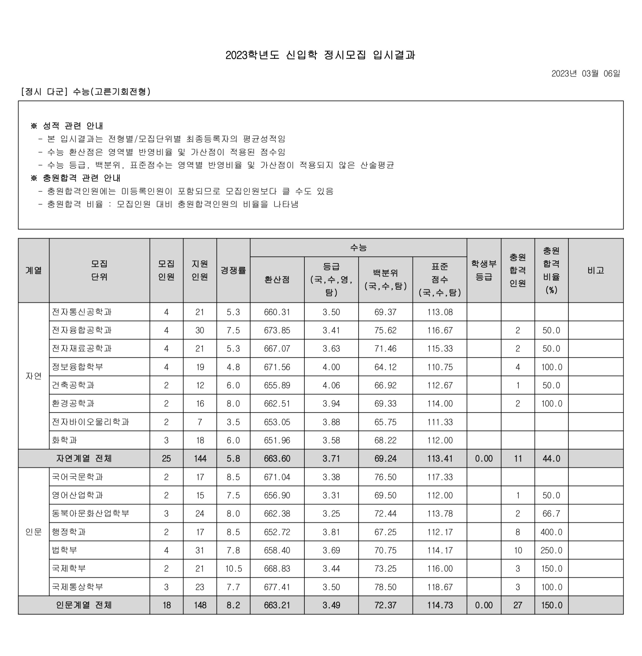 2023학년도 광운대학교 정시 다군 수능(고른기회전형) 정시등급 2023학년도 광운대학교 정시 가군 수능(농어촌학생전형) 정시등급