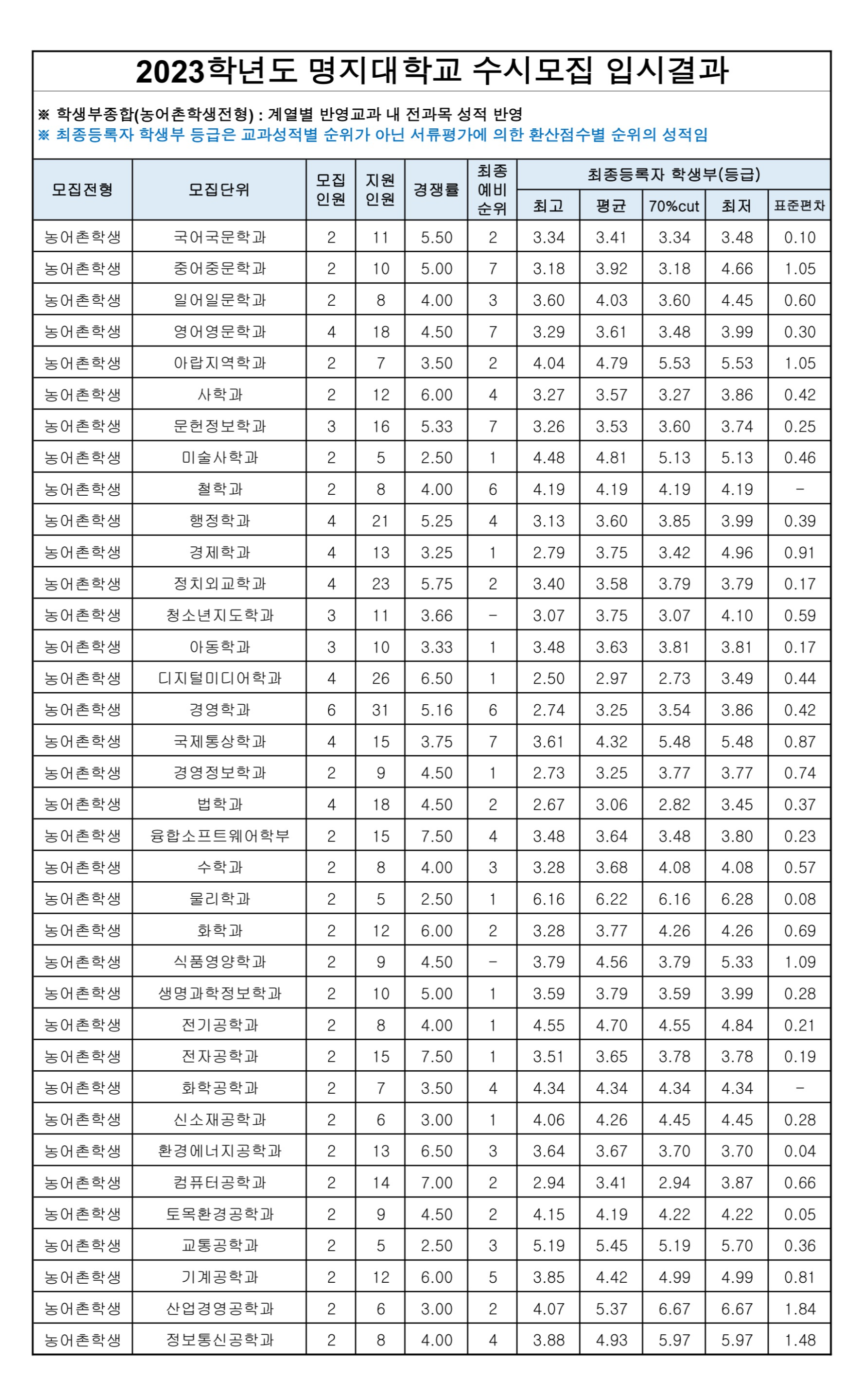 2023학년도 명지대학교 학생부종합(농어촌학생전형) 수시등급 2023학년도 명지대학교 실기/실적(실기우수자전형) 수시등급