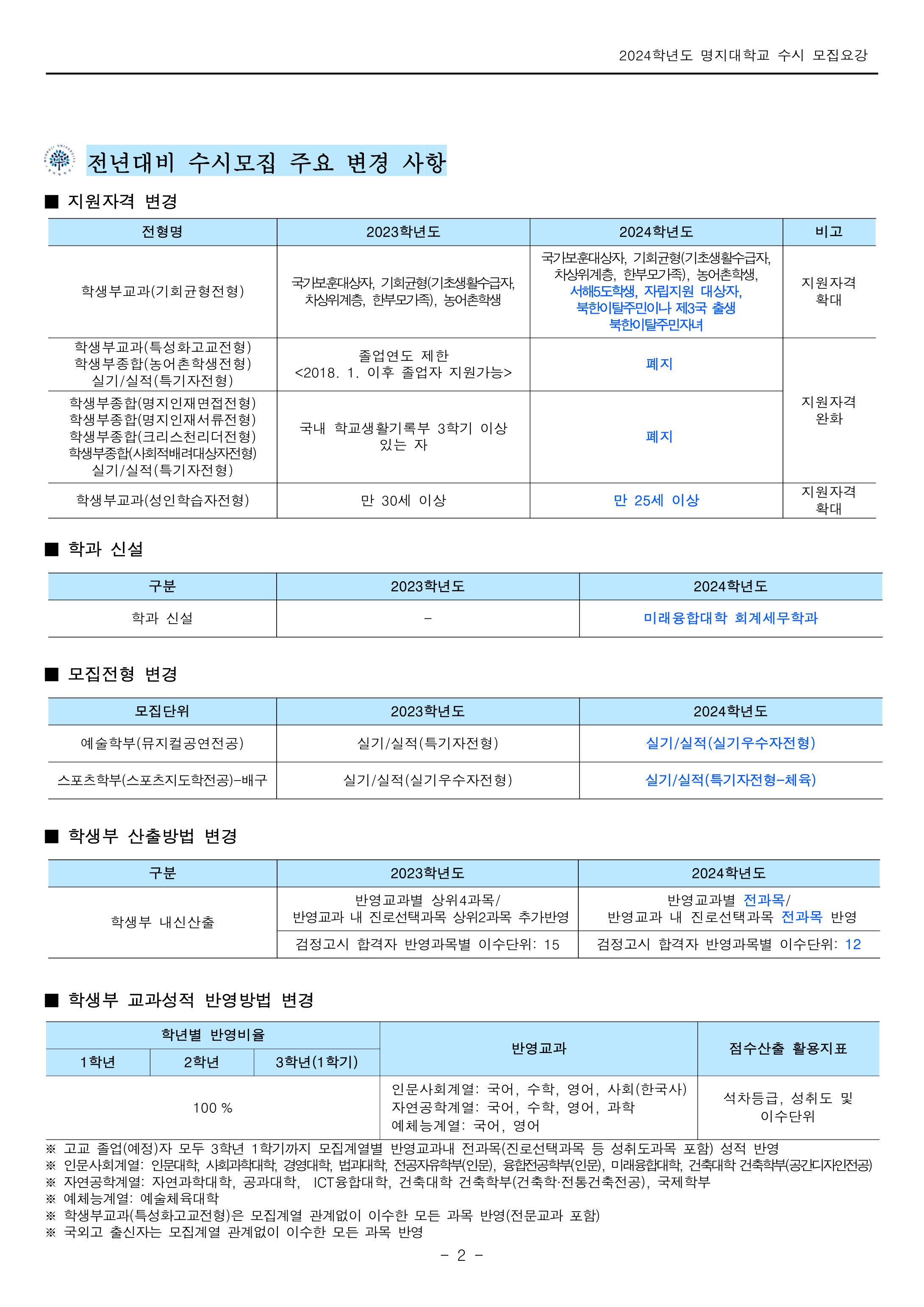 2024학년도 명지대학교 수시모집 전형요약 2024학년도 명지대학교 수시모집 주요 변경 사항