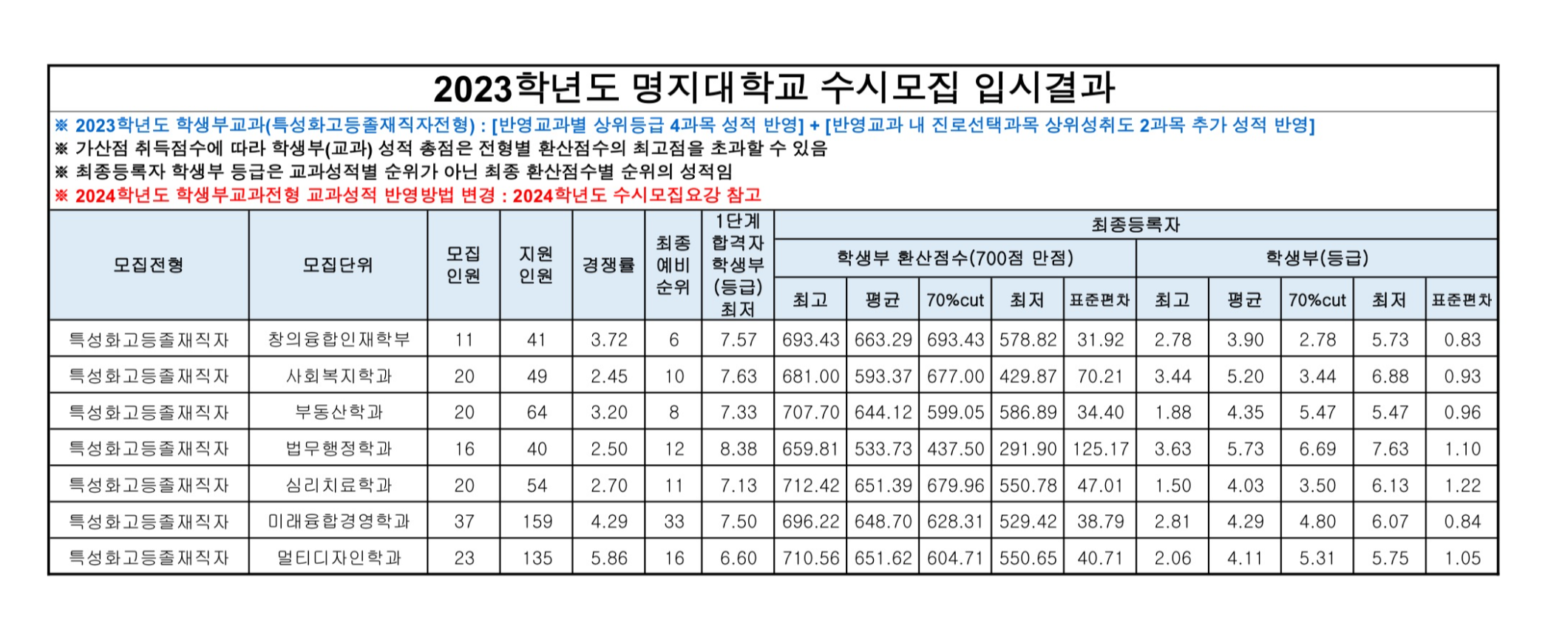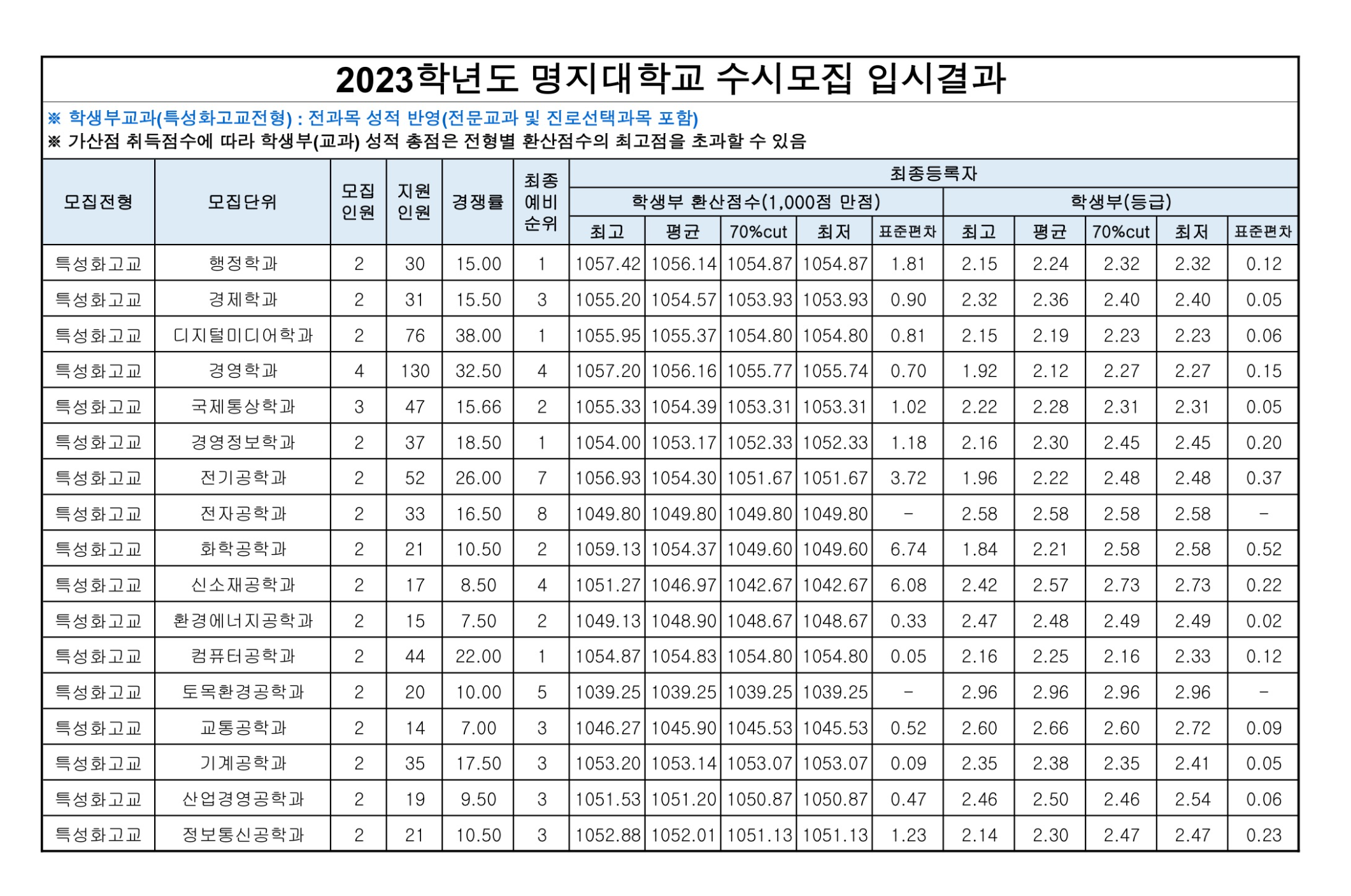 2023학년도 명지대학교 학생부교과(특성화고등졸재직자전형) 수시등급 2023학년도 명지대학교 학생부교과(특성화고교전형) 수시등급