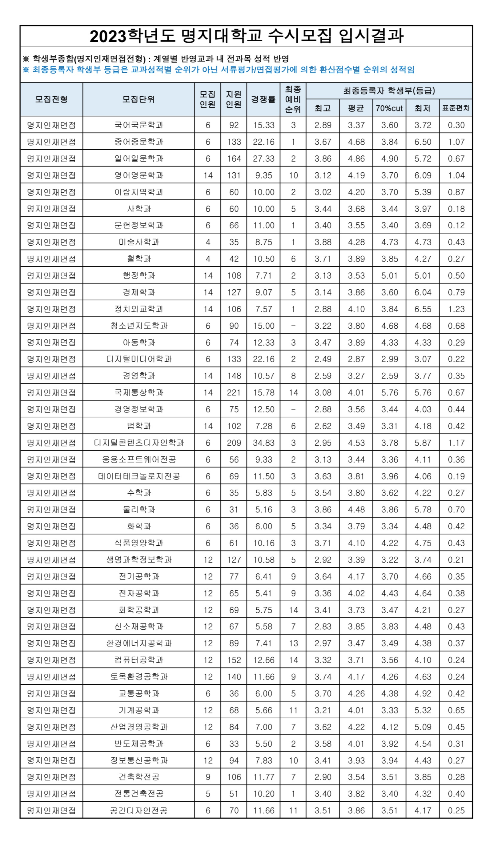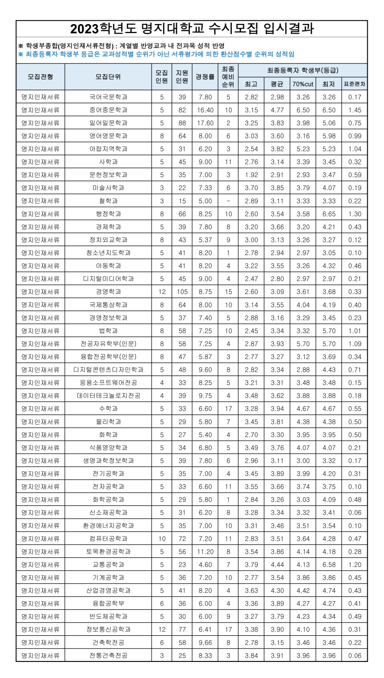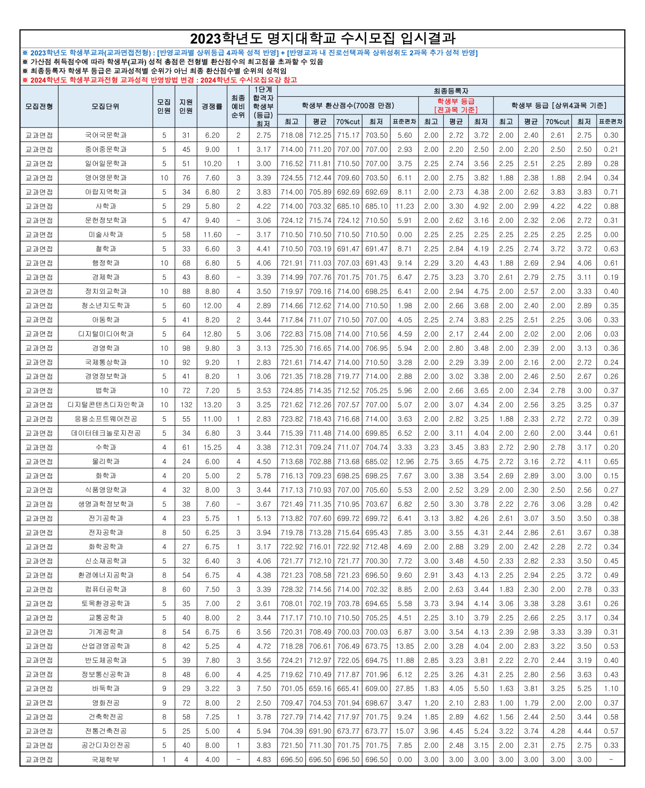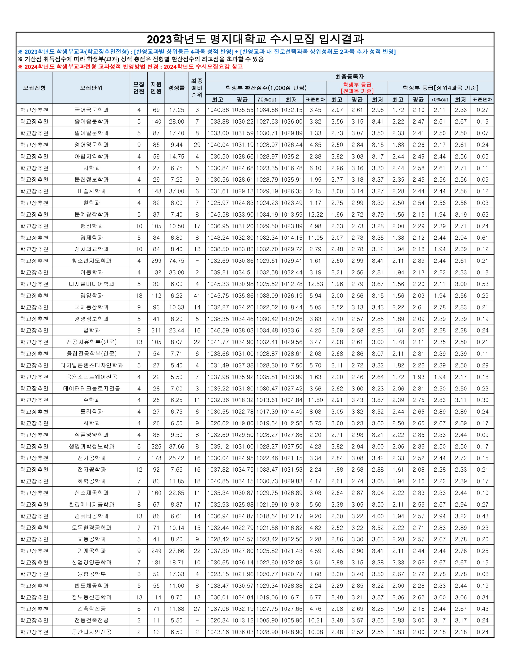 2023학년도 명지대학교 학생부교과(학교장추천전형) 수시등급 2023학년도 명지대학교 학생부교과(교과면접전형) 수시등급