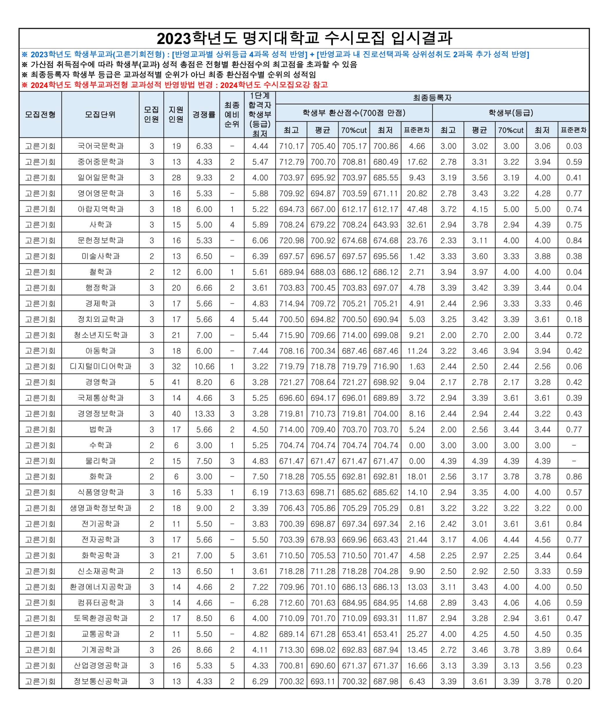 2023학년도 명지대학교 학생부교과(고른기회전형) 수시등급 2023학년도 명지대학교 학생부교과(성인학습자전형) 수시등급