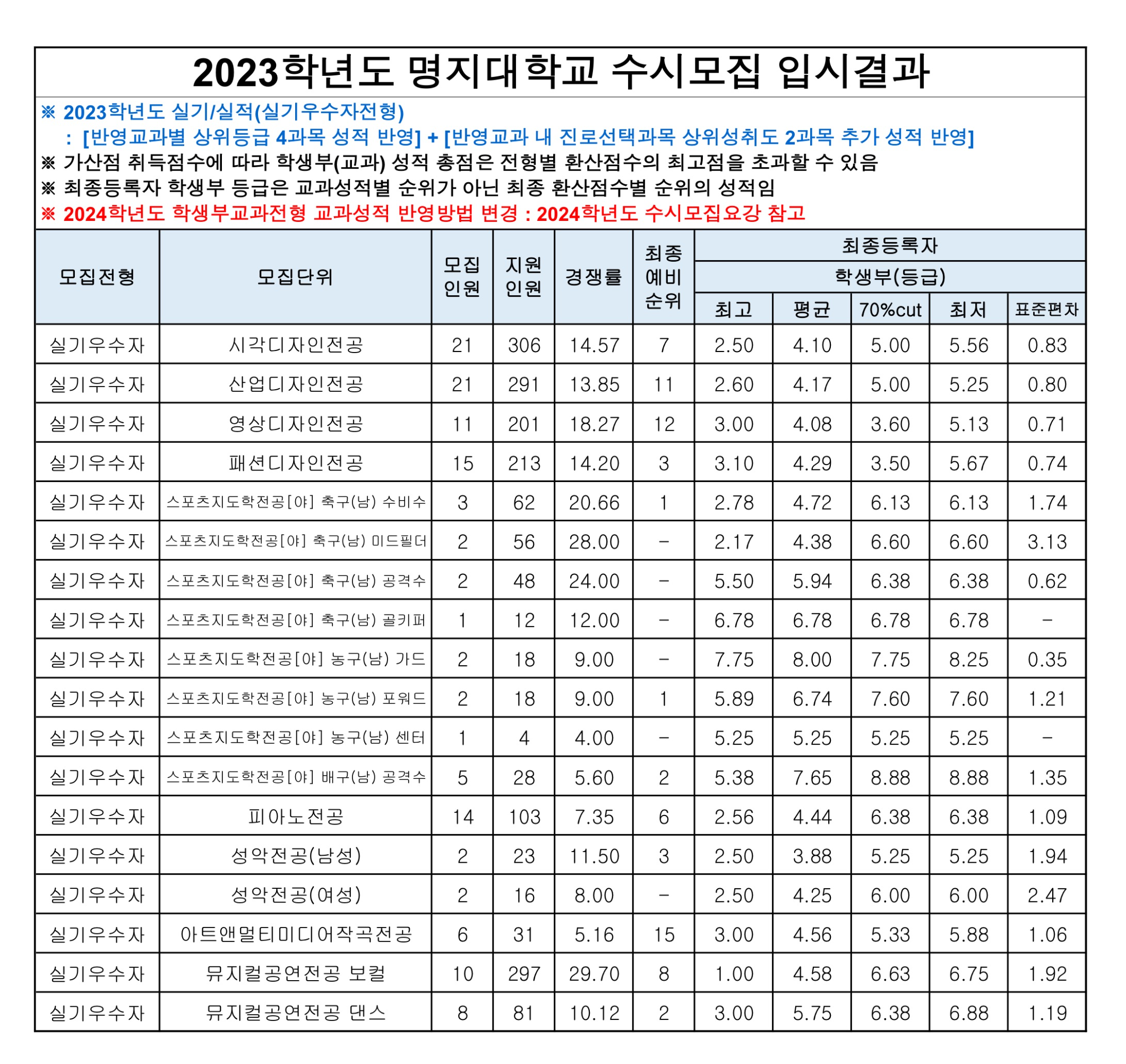 2023학년도 명지대학교 실기/실적(실기우수자전형) 수시등급 2023학년도 명지대학교 실기/실적(특기자전형) 수시등급