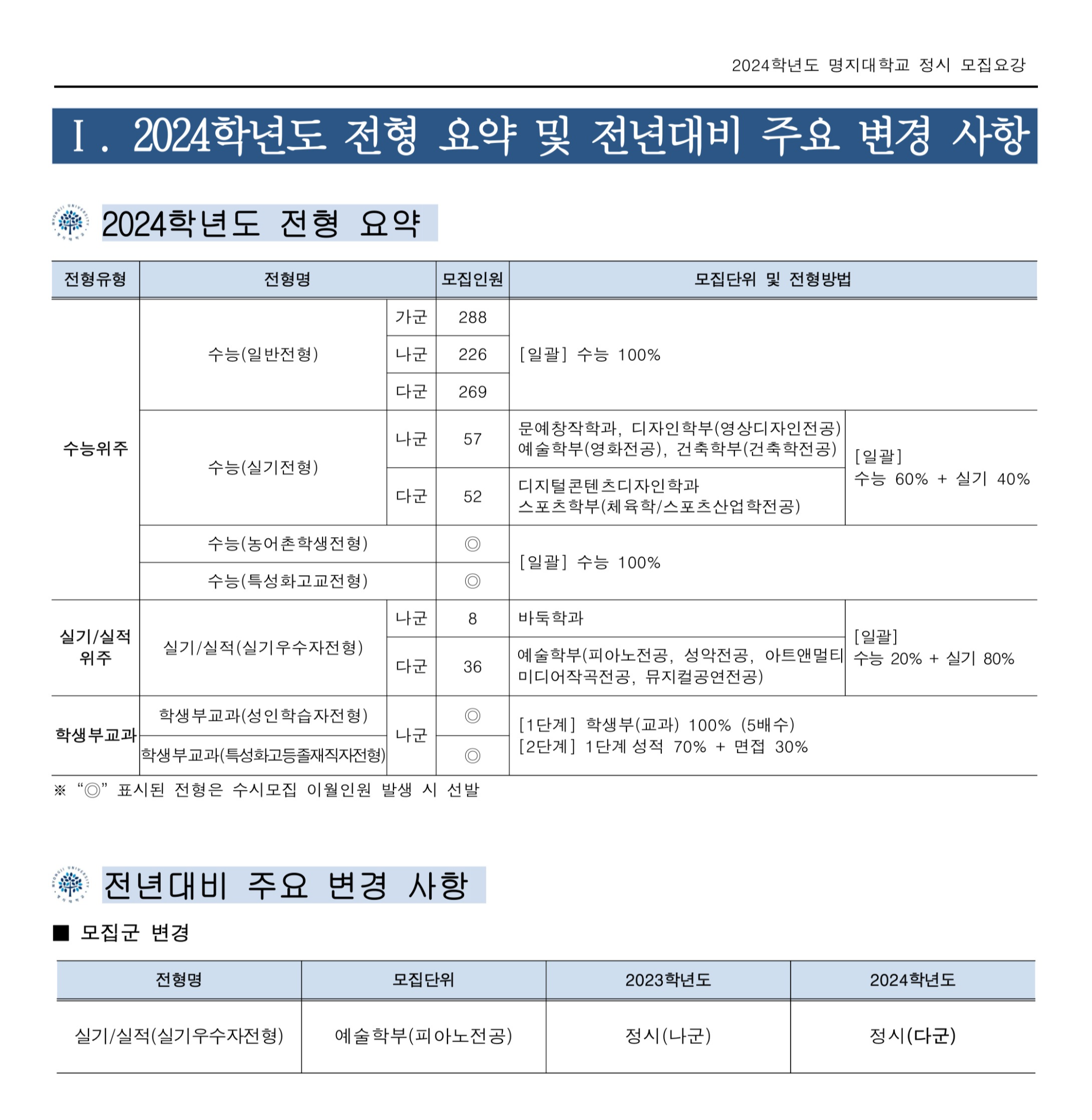 2024학년도 명지대학교 정시모집 요강.pdf0.95MB2024학년도 명지대학교 정시모집 전형 요약 및 전년 대비 변경사항