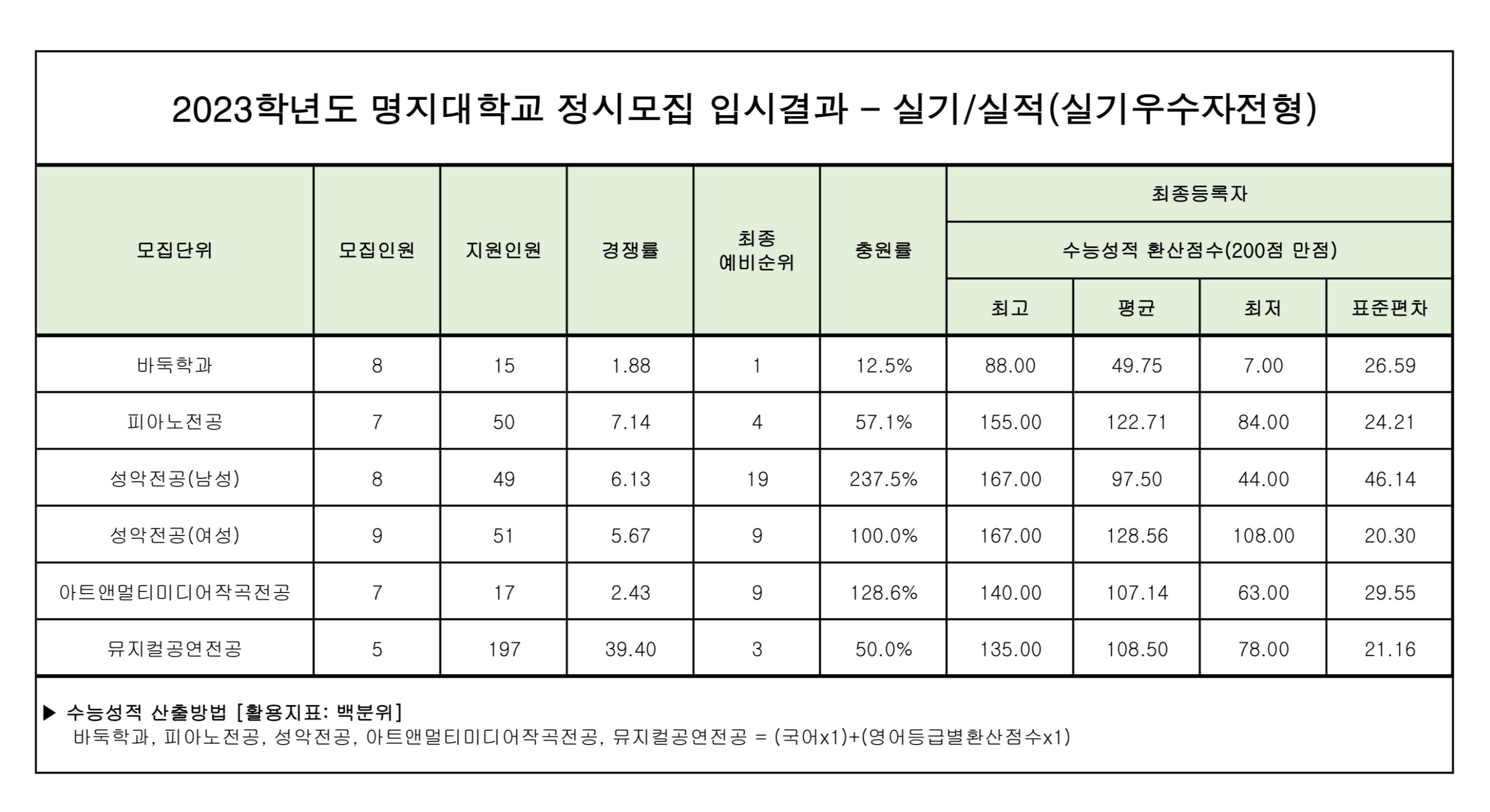 2023학년도 명지대학교 수능(실기전형) 정시등급 2023학년도 명지대학교 실기/실적(실기우수자전형) 정시등급