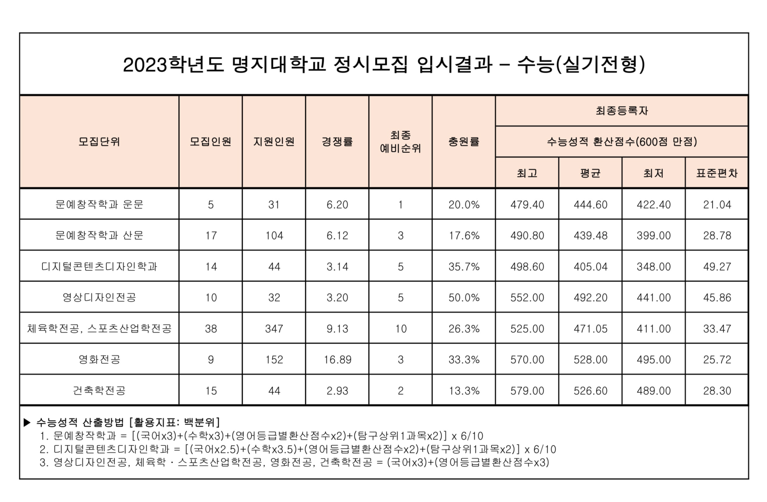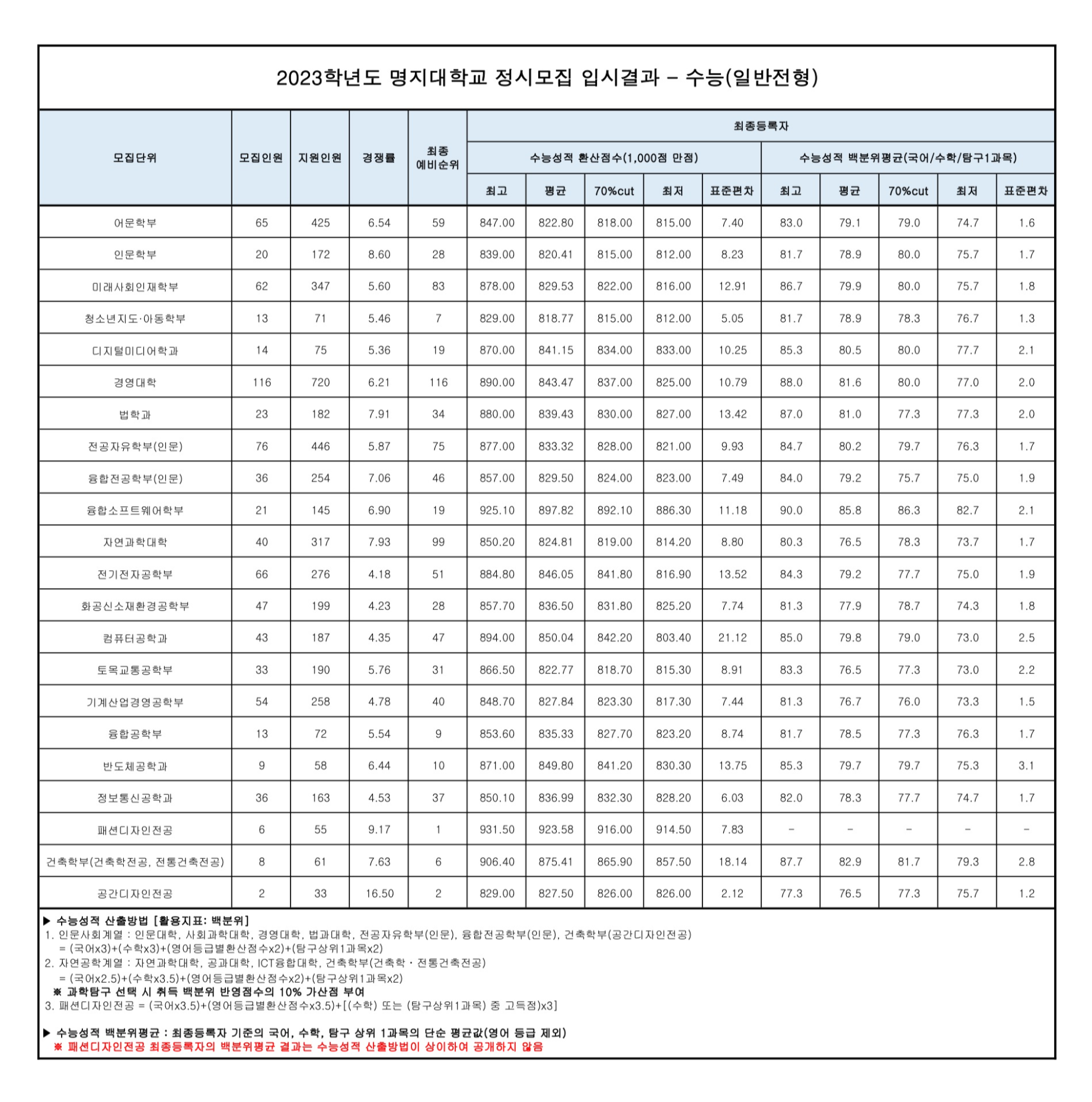 2023학년도 명지대학교 수능(일반전형) 정시등급 2023학년도 명지대학교 수능(실기전형) 정시등급