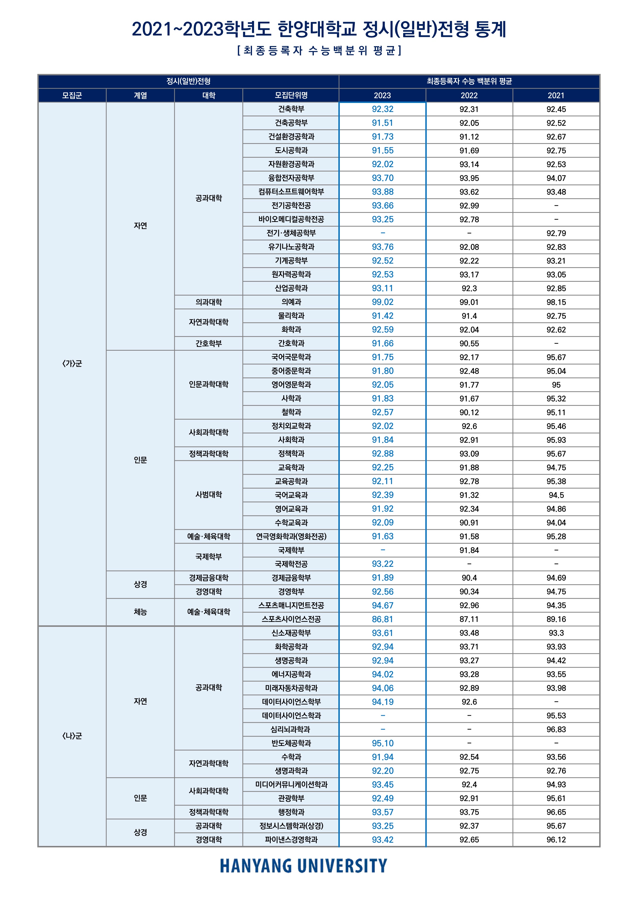 2021~2023학년도 한양대학교 정시(일반)전형 정시등급 2023학년도 한양대학교 정시등급