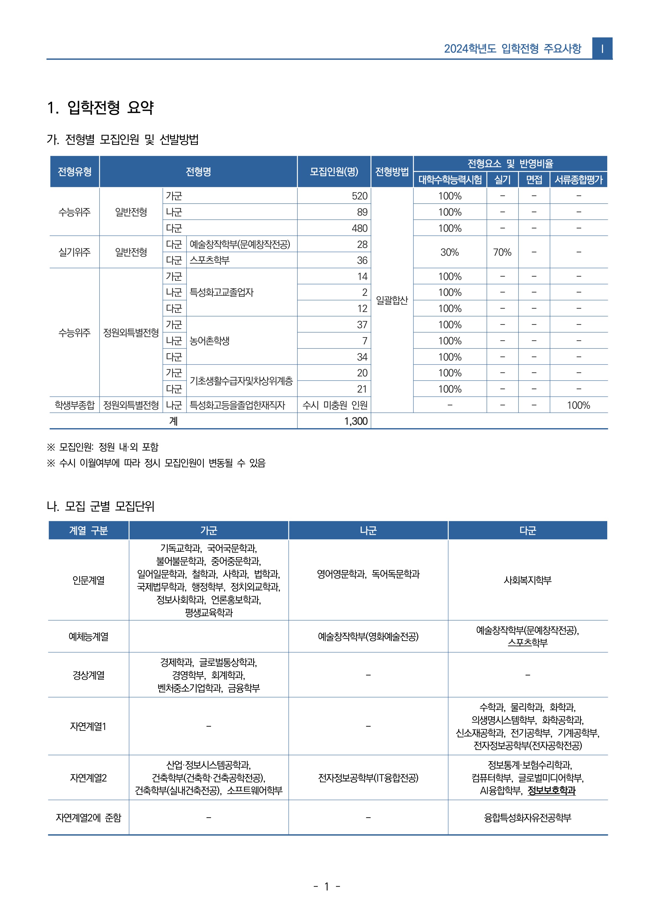 2024학년도 숭실대학교 정시모집 주요 변경사항 2024학년도 숭실대학교 정시모집 입학정원 및 개설전공