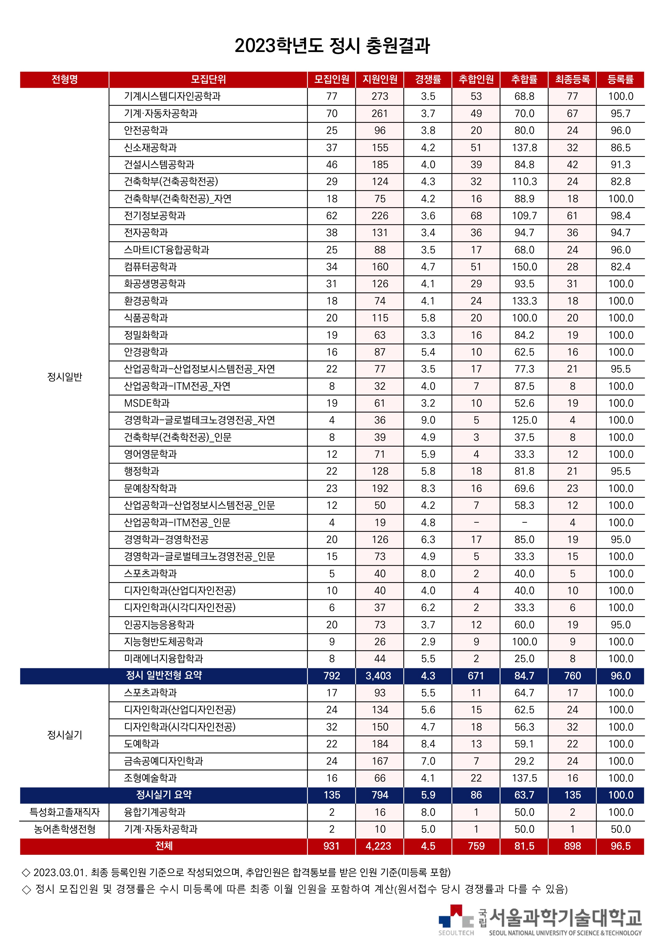 2023학년도 서울과학기술대학교 정시 충원결과 2023학년도 서울과학기술대학교 정시등급