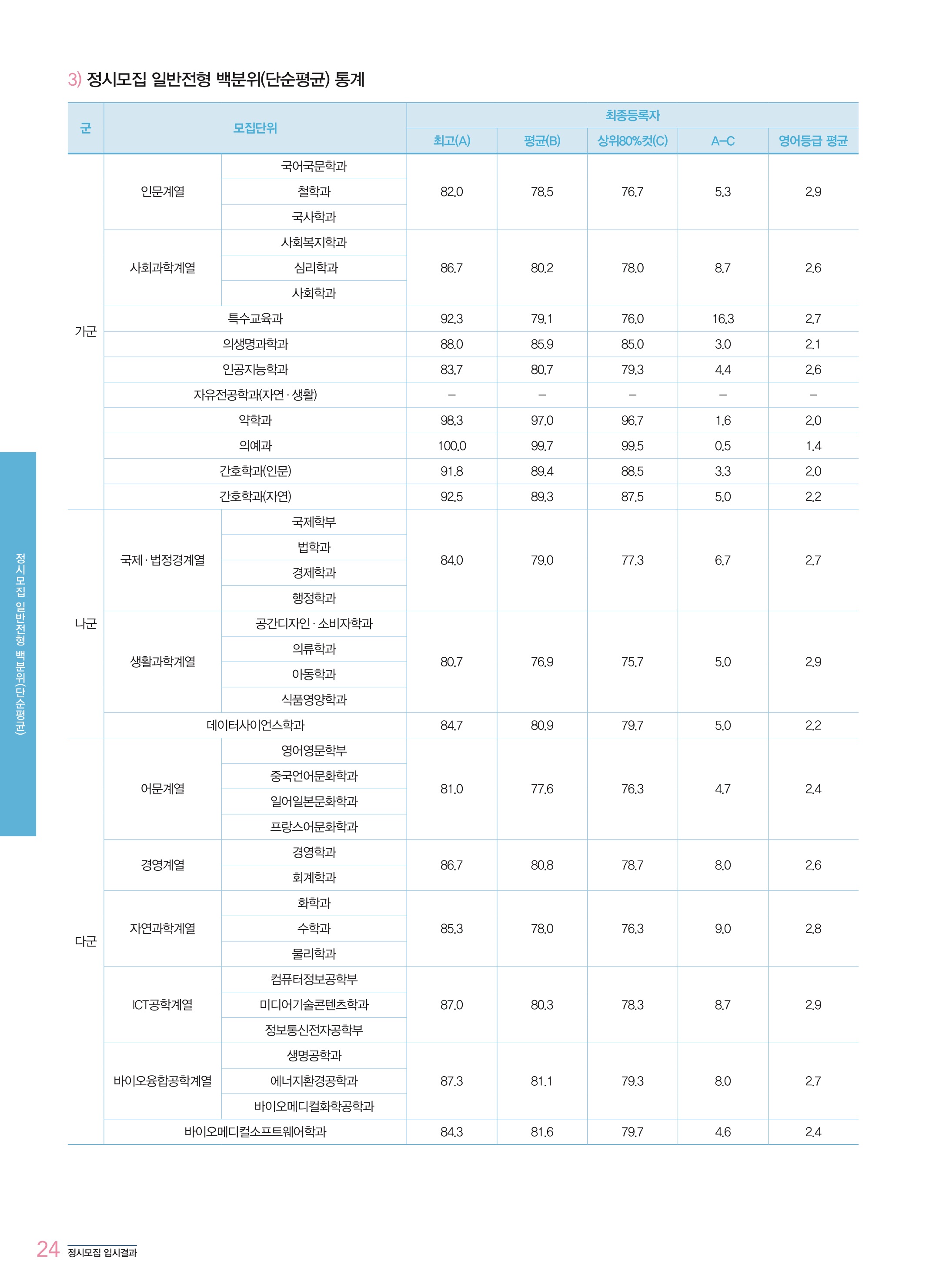 인문계열 국어국문학과 38 7.32 49 618.68 1000.00 77.67 철학과 국사학과 사회과학계열 사회복지학과 51 7.02 59 622.42 79.00 심리학과 사회학과 특수교육과 12 5.33 10 619.58 77.33 의생명과학과 16 4.50 15 645.09 85.33 인공지능학과 15 7.80 24 633.91 80.00 약학과 10 6.20 5 701.39 96.83 의예과 37 3.43 10 725.92 99.50 간호학과(인문) 16 3.63 3 663.13 89.67 간호학과(자연) 16 4.13 8 659.16 88.00 나군