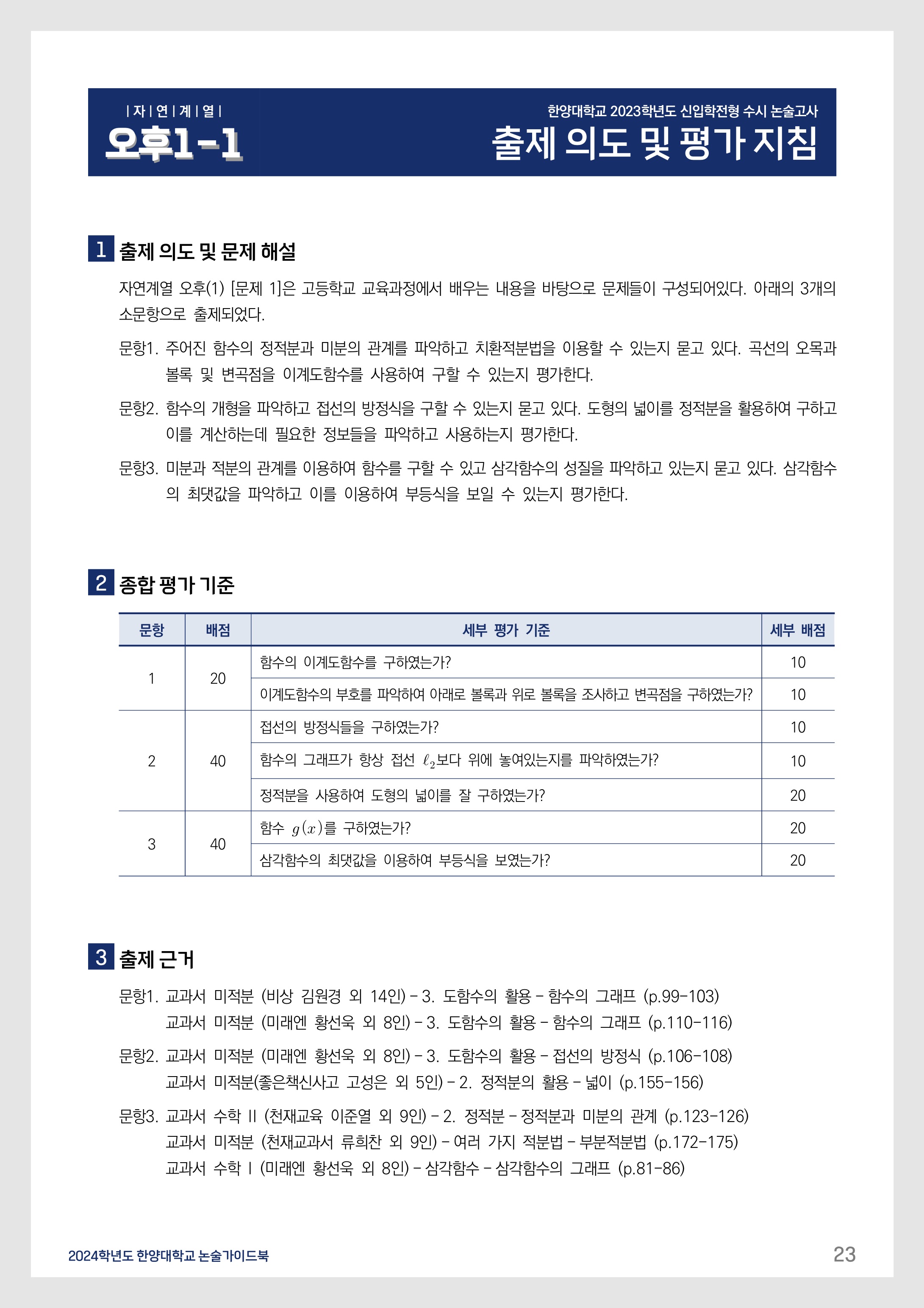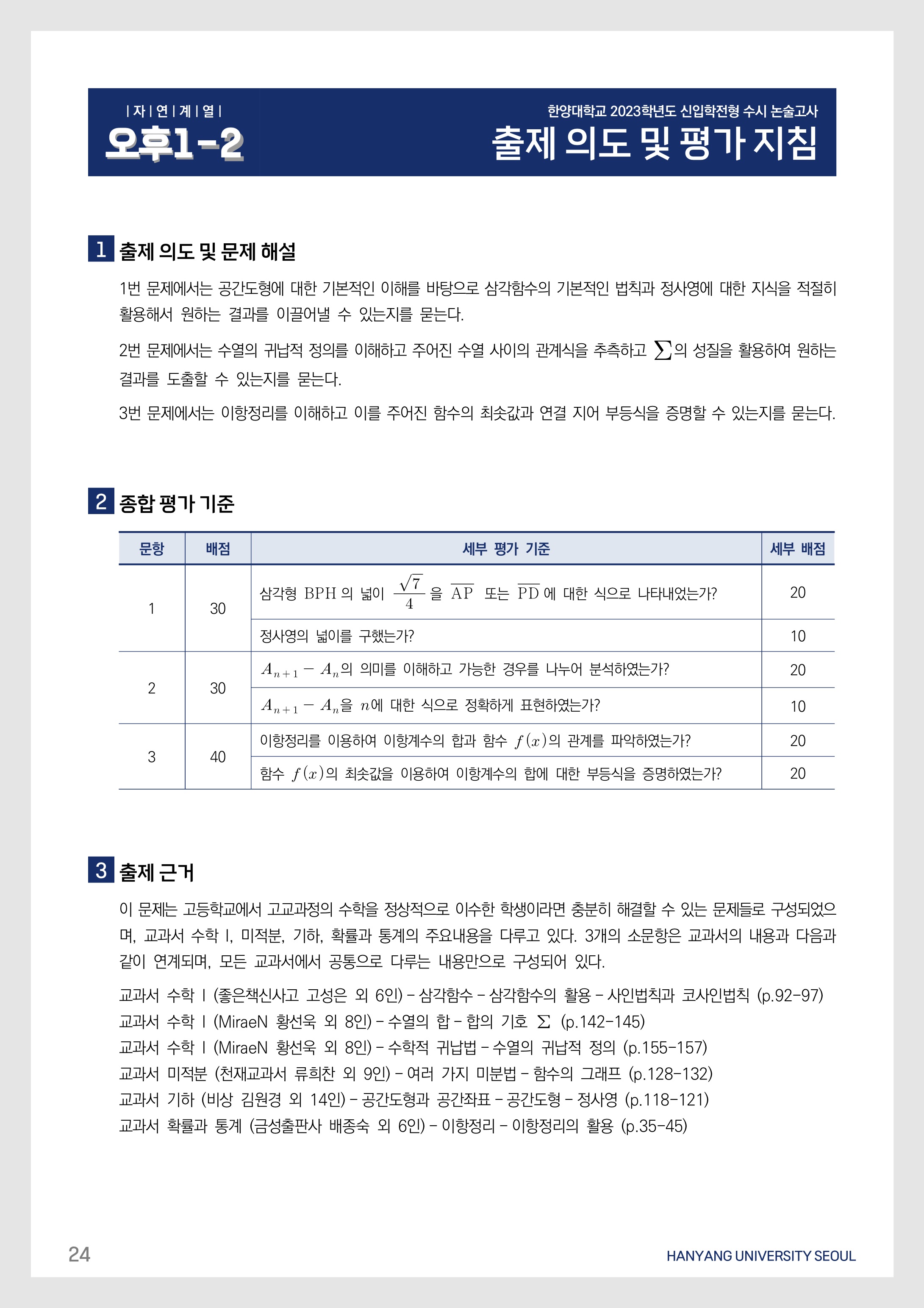 2023학년도 한양대학교 논술전형 자연계열(오후1) 문제 2023학년도 한양대학교 논술전형 자연계열(오후1) 출제 의도 및 평가 지침
