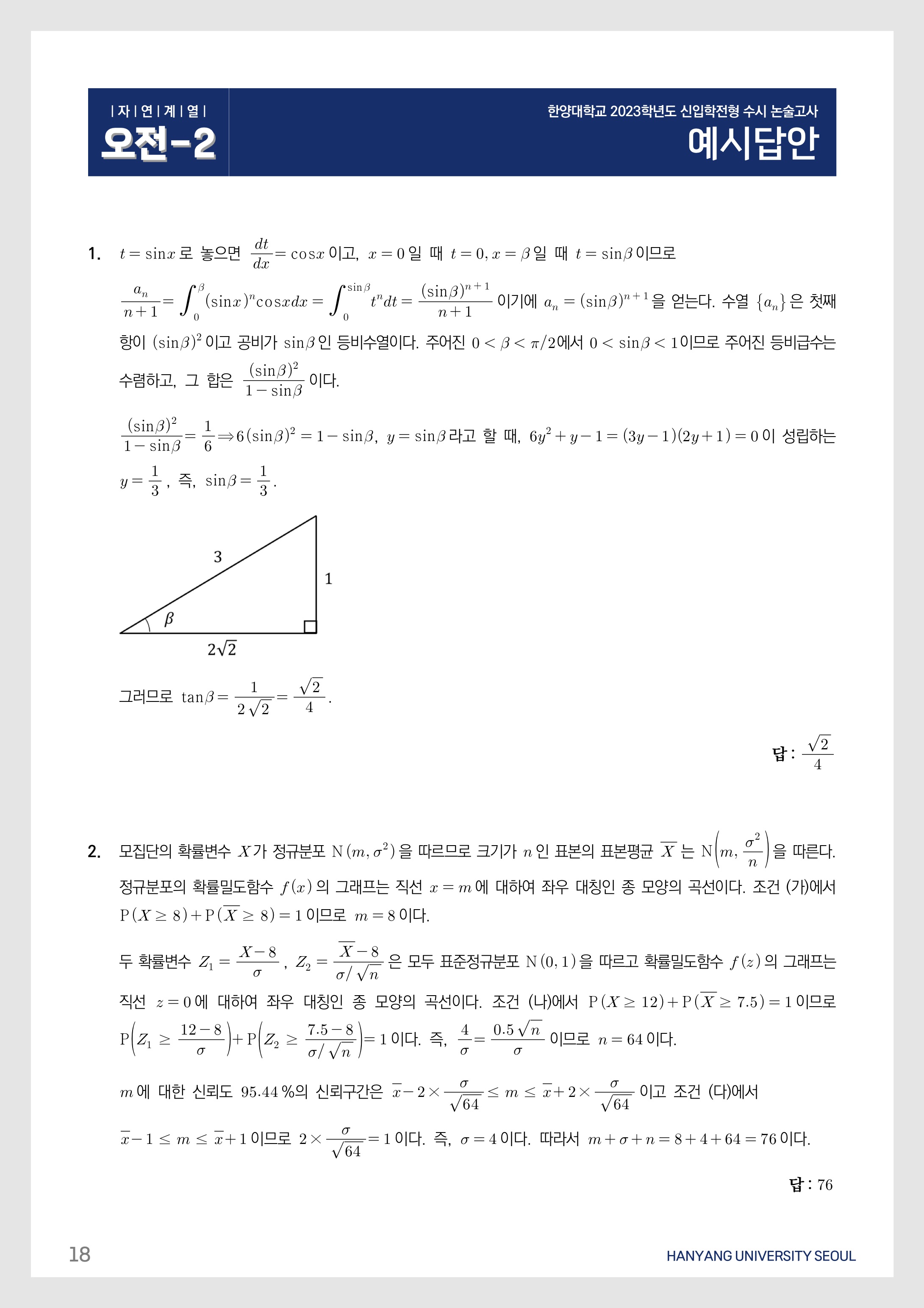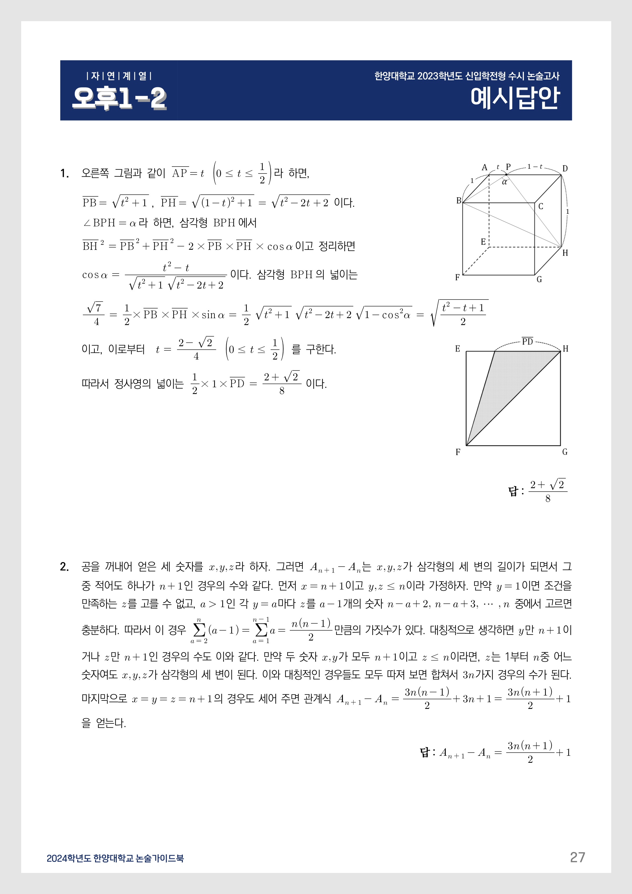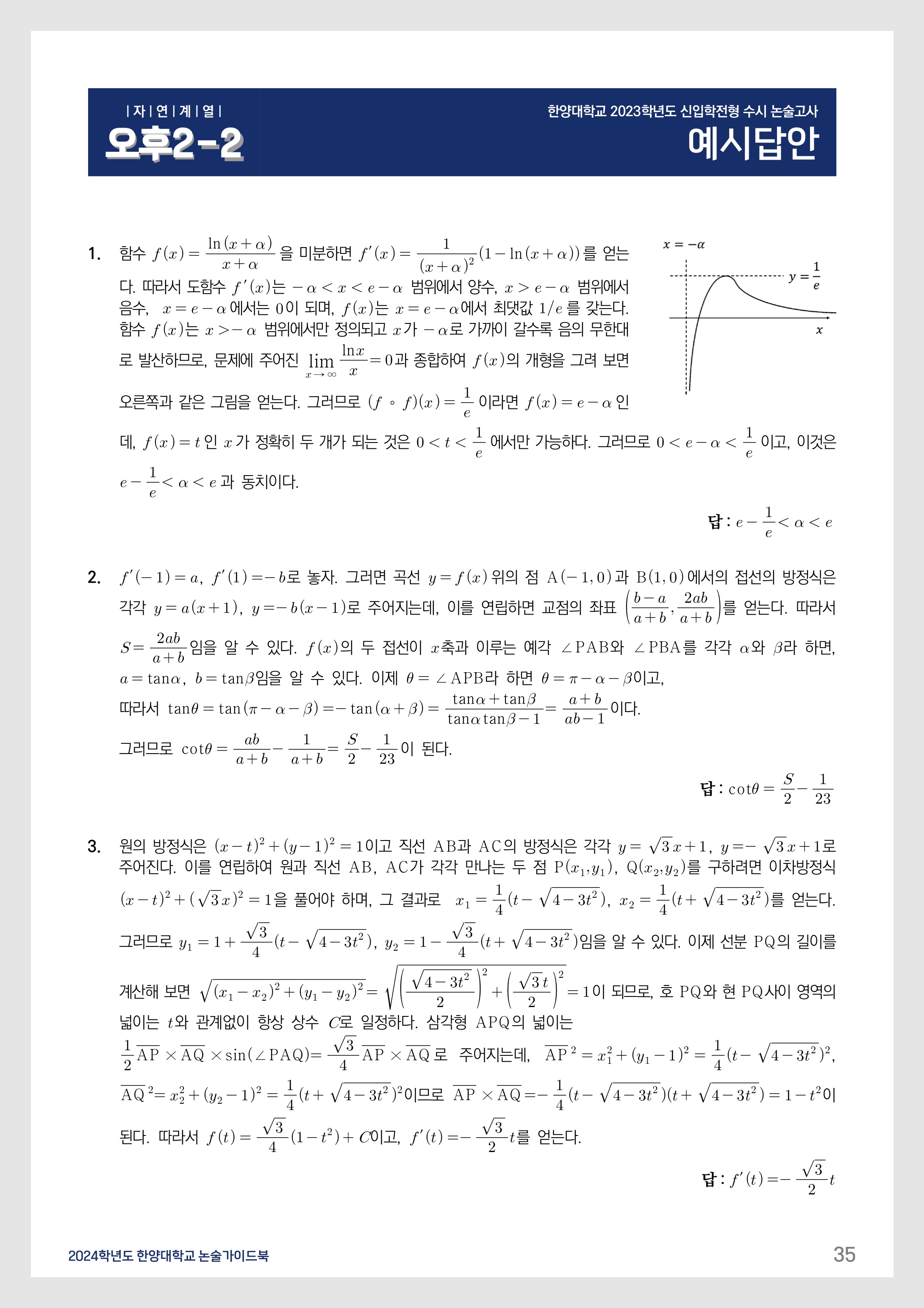 2023학년도 한양대학교 논술전형 자연계열(오후1) 예시답안 2023학년도 한양대학교 논술전형 자연계열(오후2) 문제