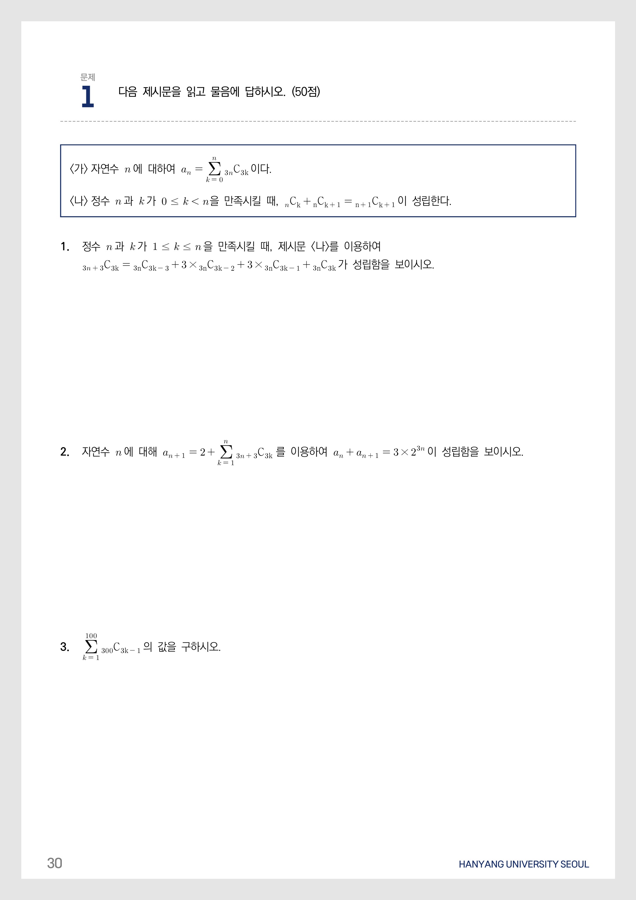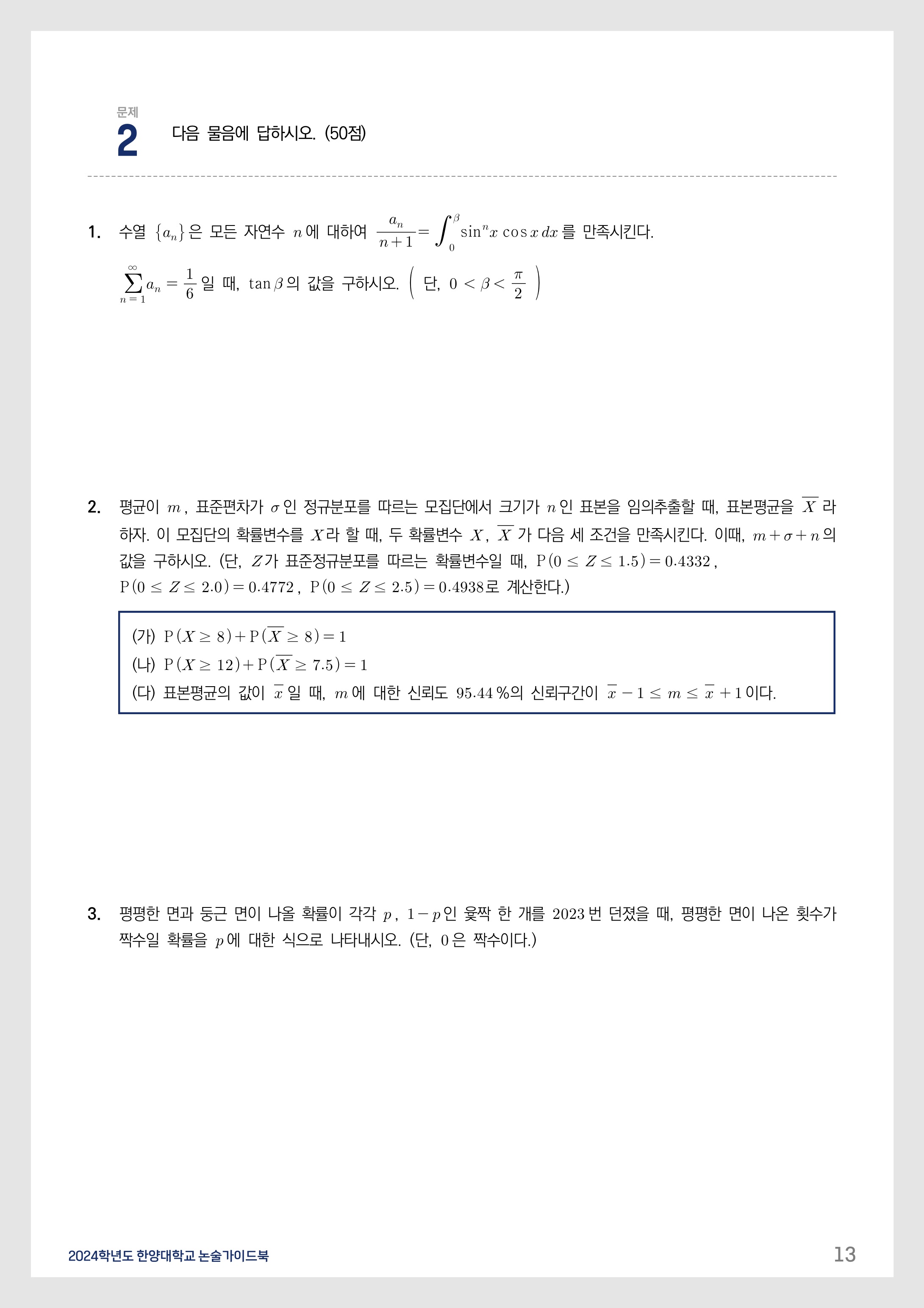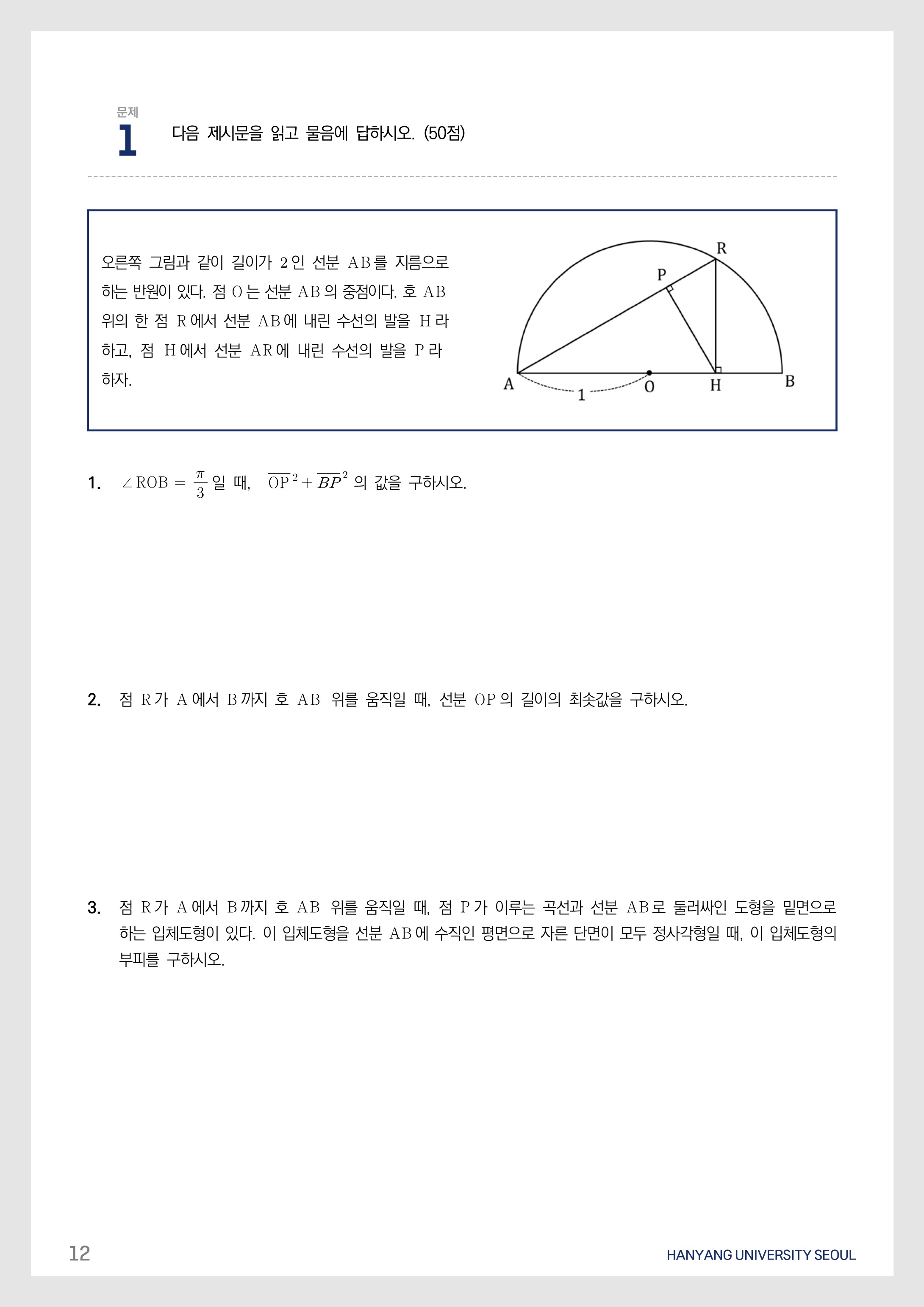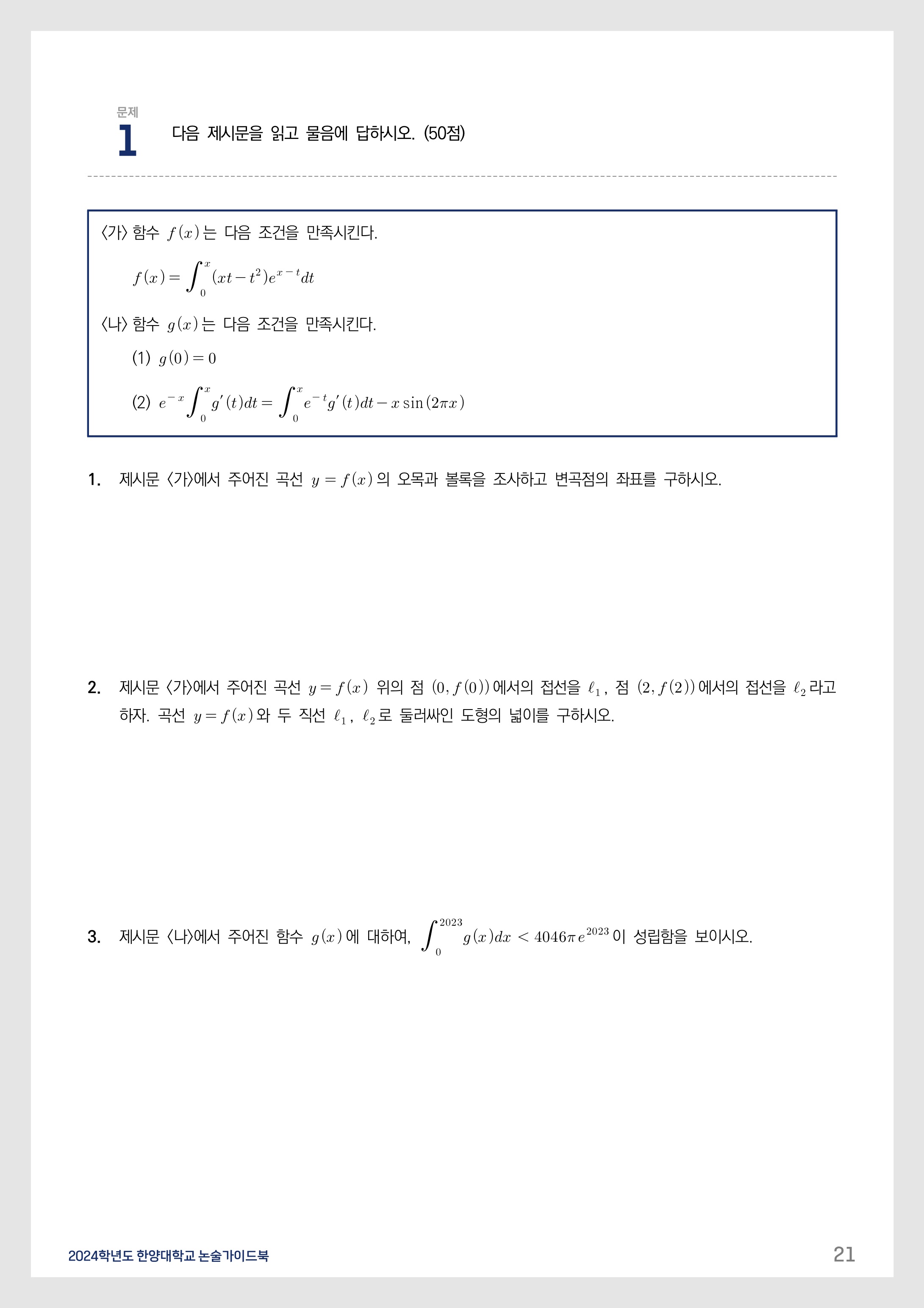 2023학년도 한양대학교 논술전형 자연계열(오후1) 예시답안 2023학년도 한양대학교 논술전형 자연계열(오후2) 문제