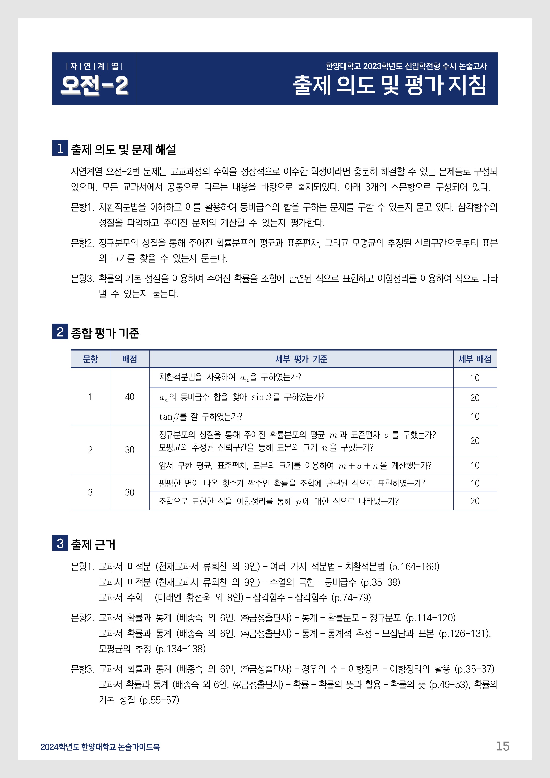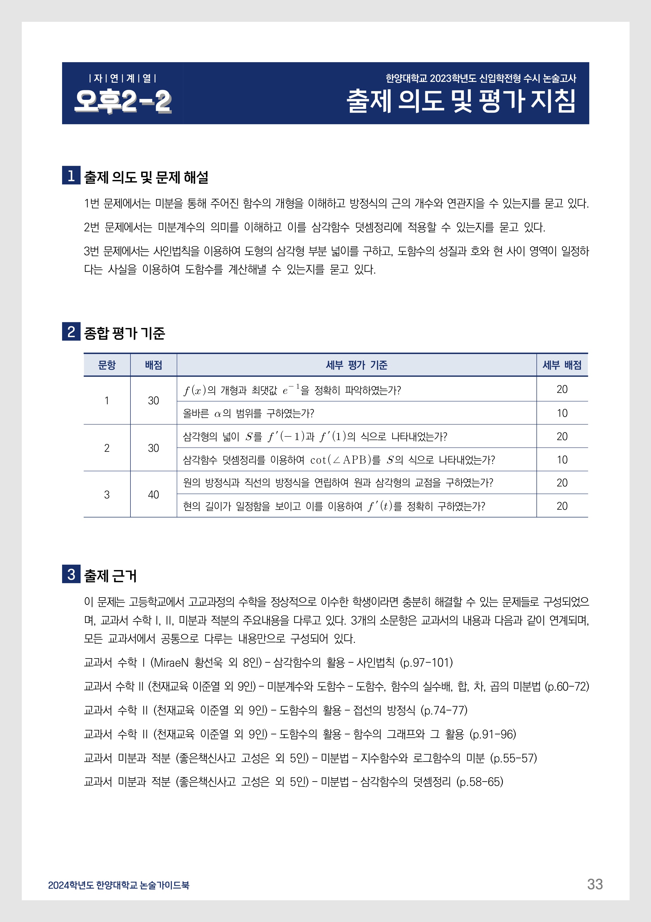 2023학년도 한양대학교 논술전형 자연계열(오후2) 출제 의도 및 평가 지침