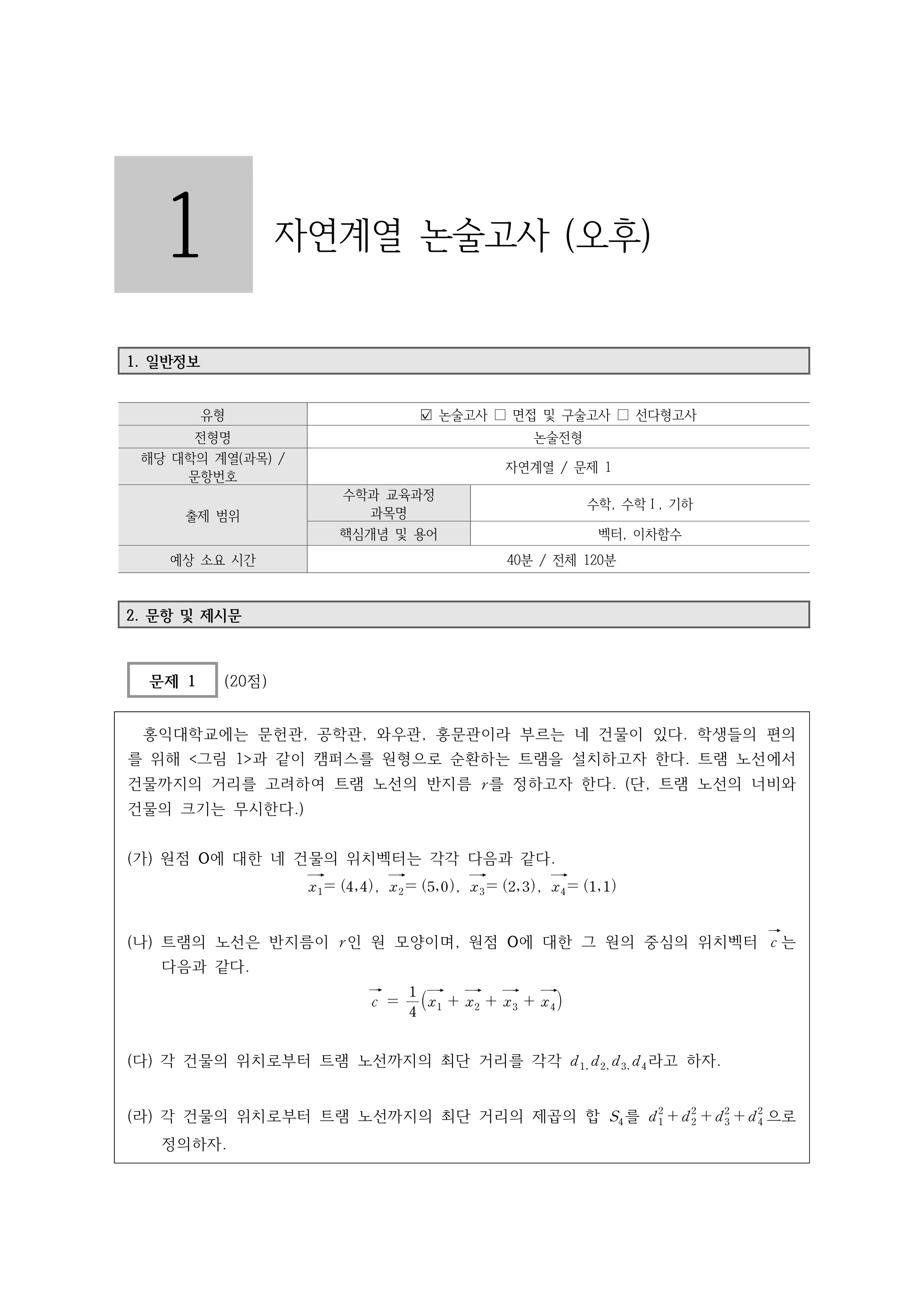 2023학년도 홍익대학교 논술 전형 기출문제 - 자연계열 오전 2023학년도 홍익대학교 논술 전형 문제 및 해설 - 자연계열 오전