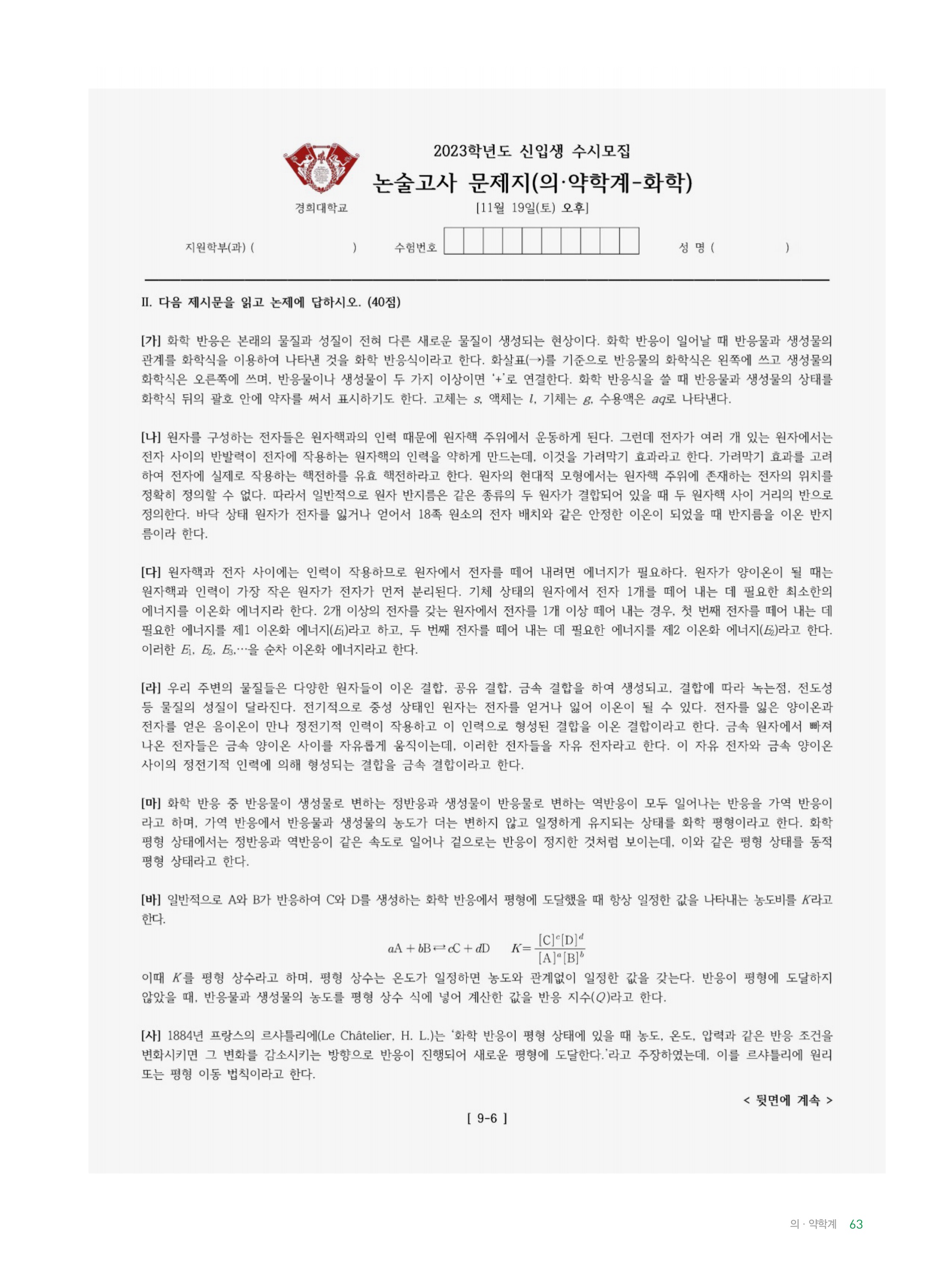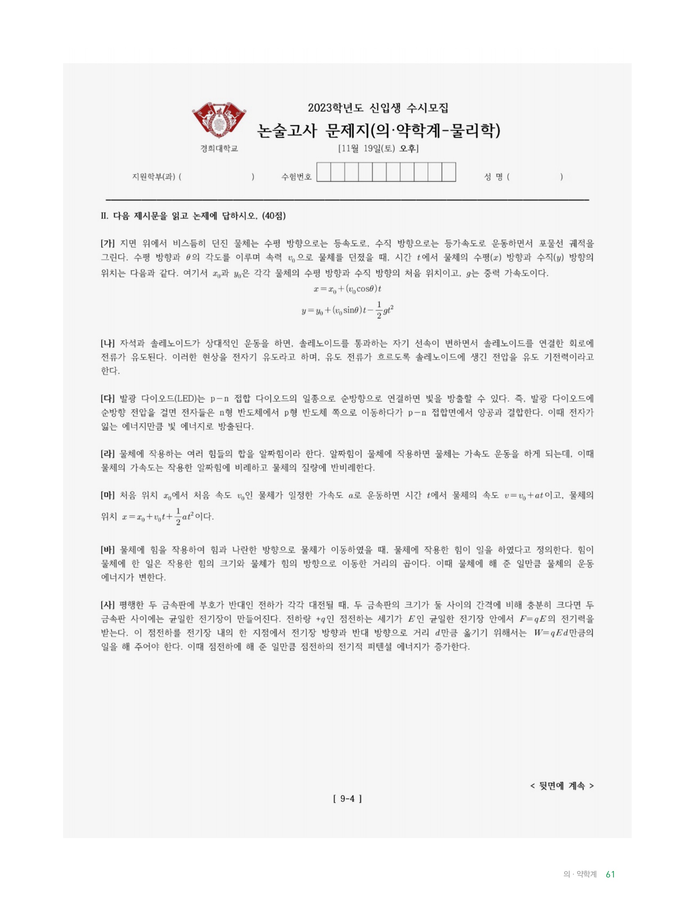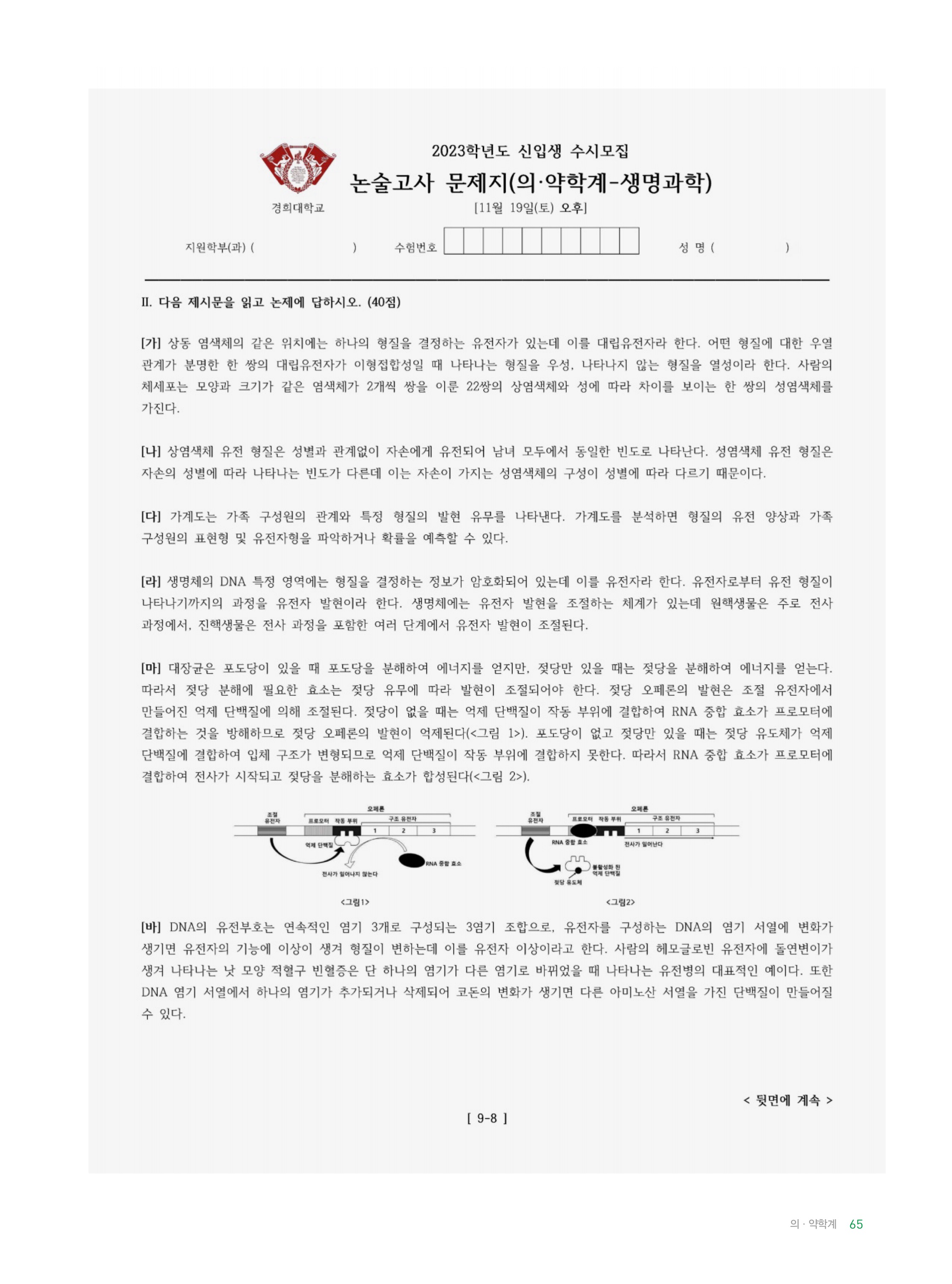2023학년도 경희대학교 논술고사 문제지(자연계Ⅱ) 2023학년도 경희대학교 논술고사 문제지(의·약학계)