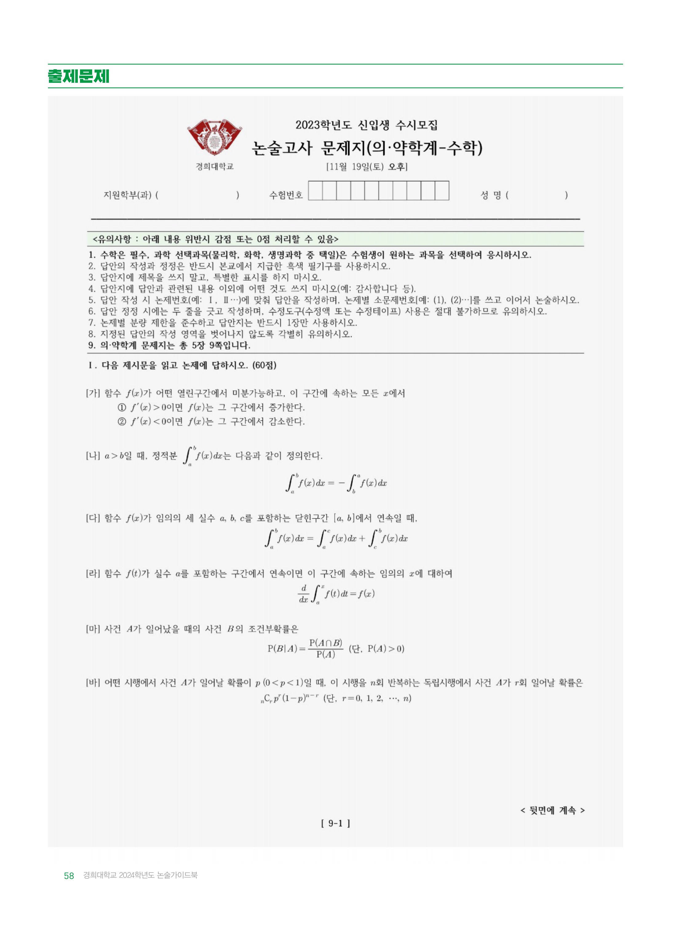 2023학년도 경희대학교 논술고사 문제지(의약학계) 2023학년도 경희대학교 논술고사 문제 및 해설