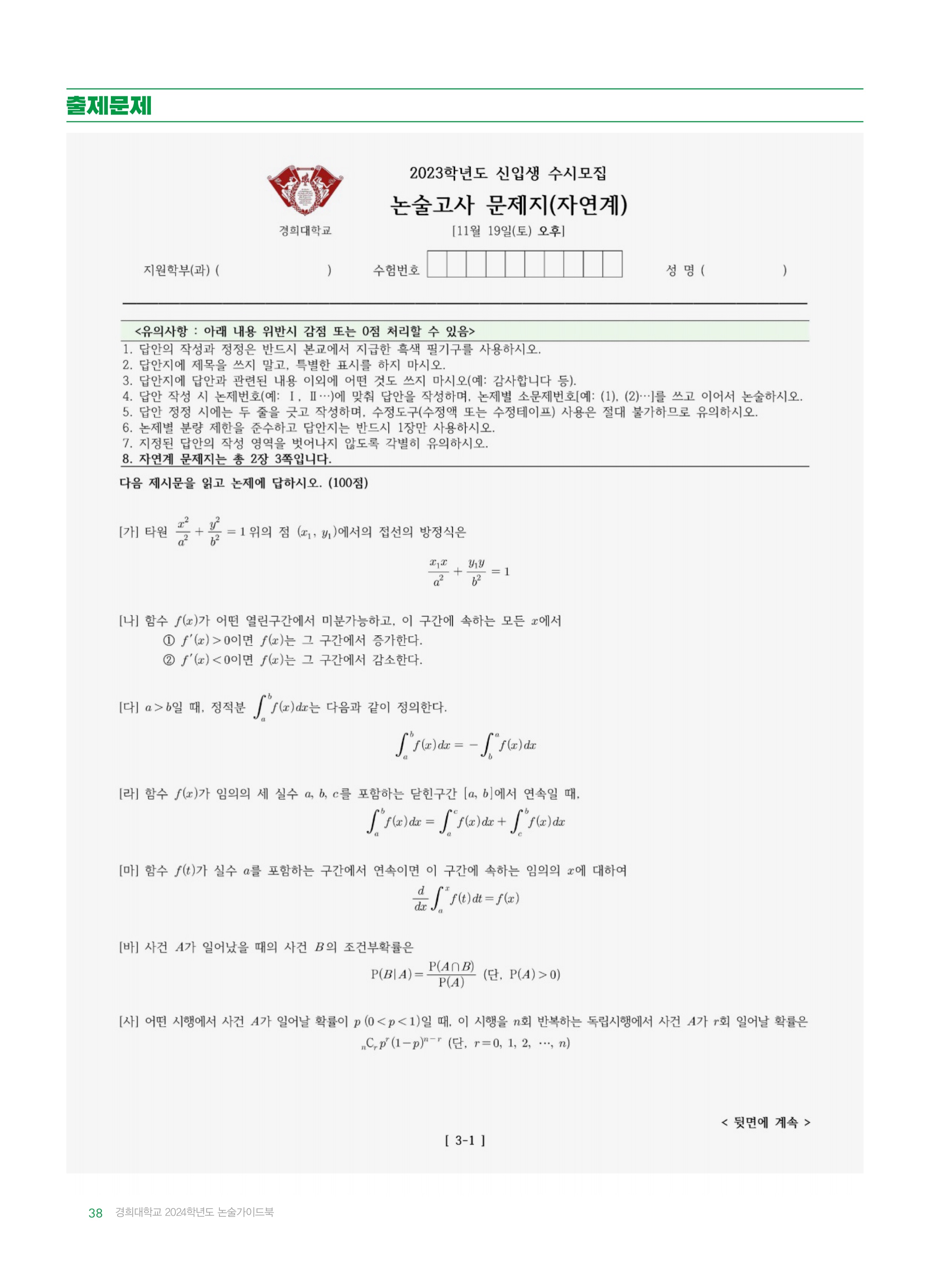 2023학년도 경희대학교 논술고사 문제지(자연계Ⅰ) 2023학년도 경희대학교 논술고사 문제지(자연계Ⅱ)
