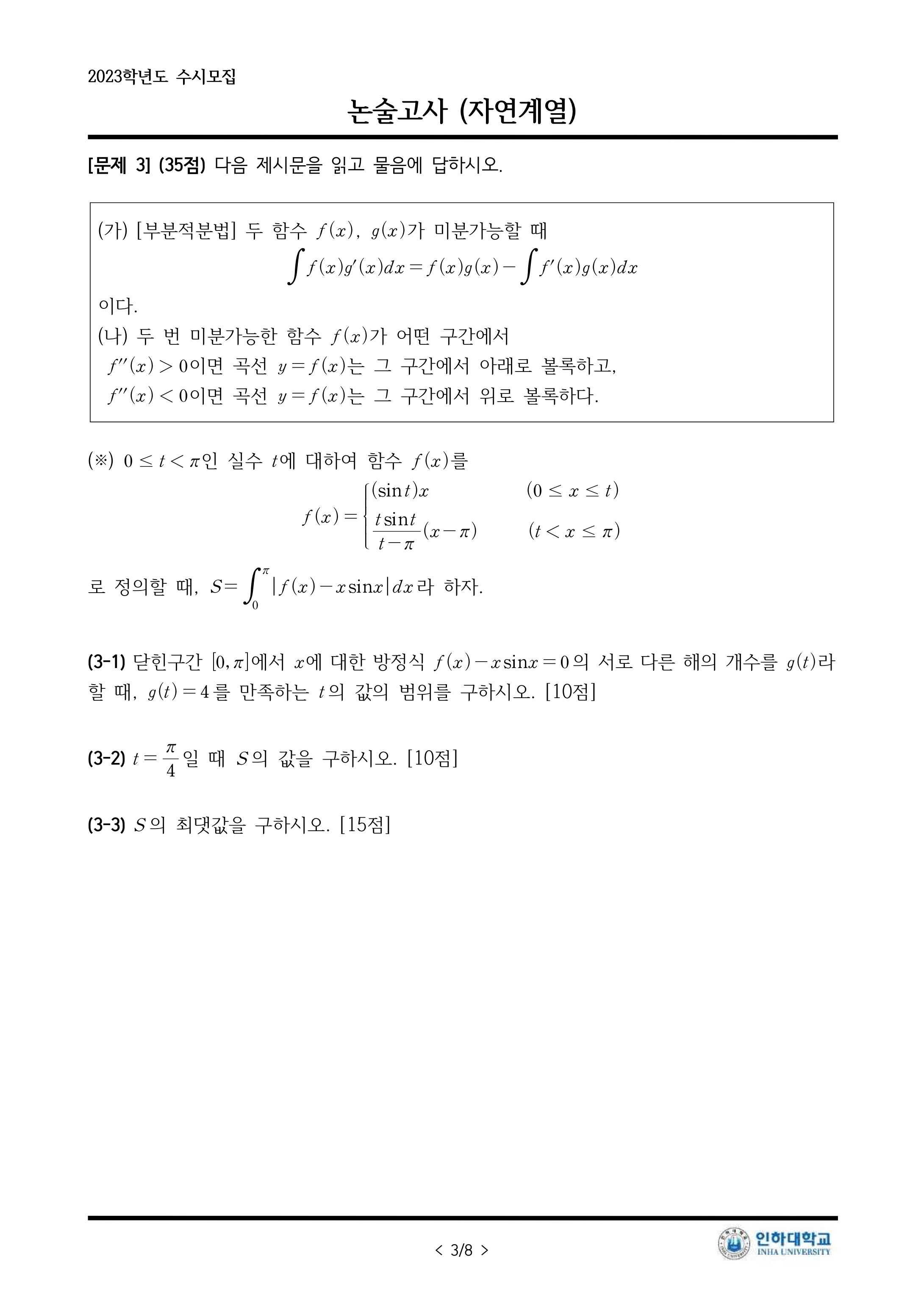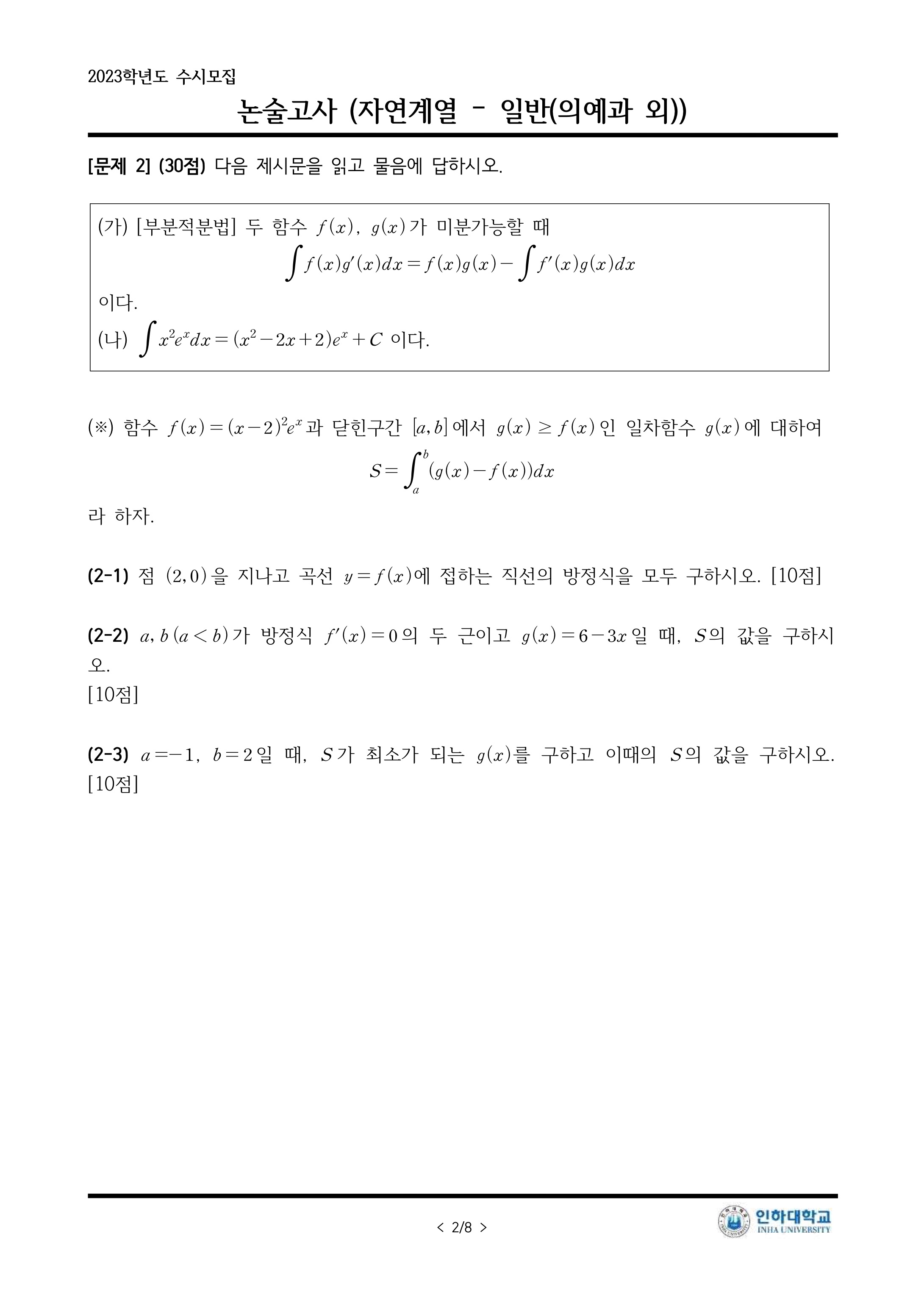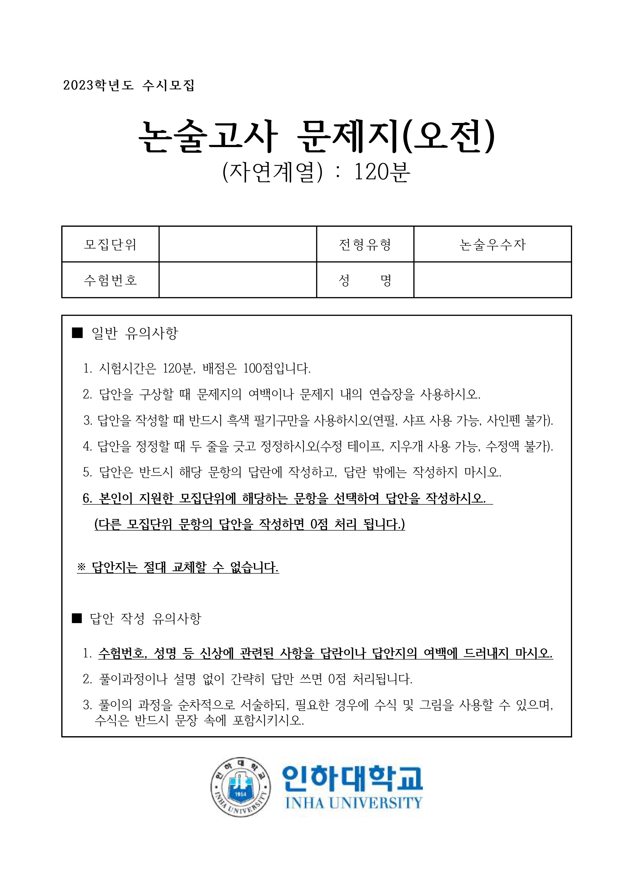 2023학년도 인하대학교 논술고사 문제지 (자연계열 오전)