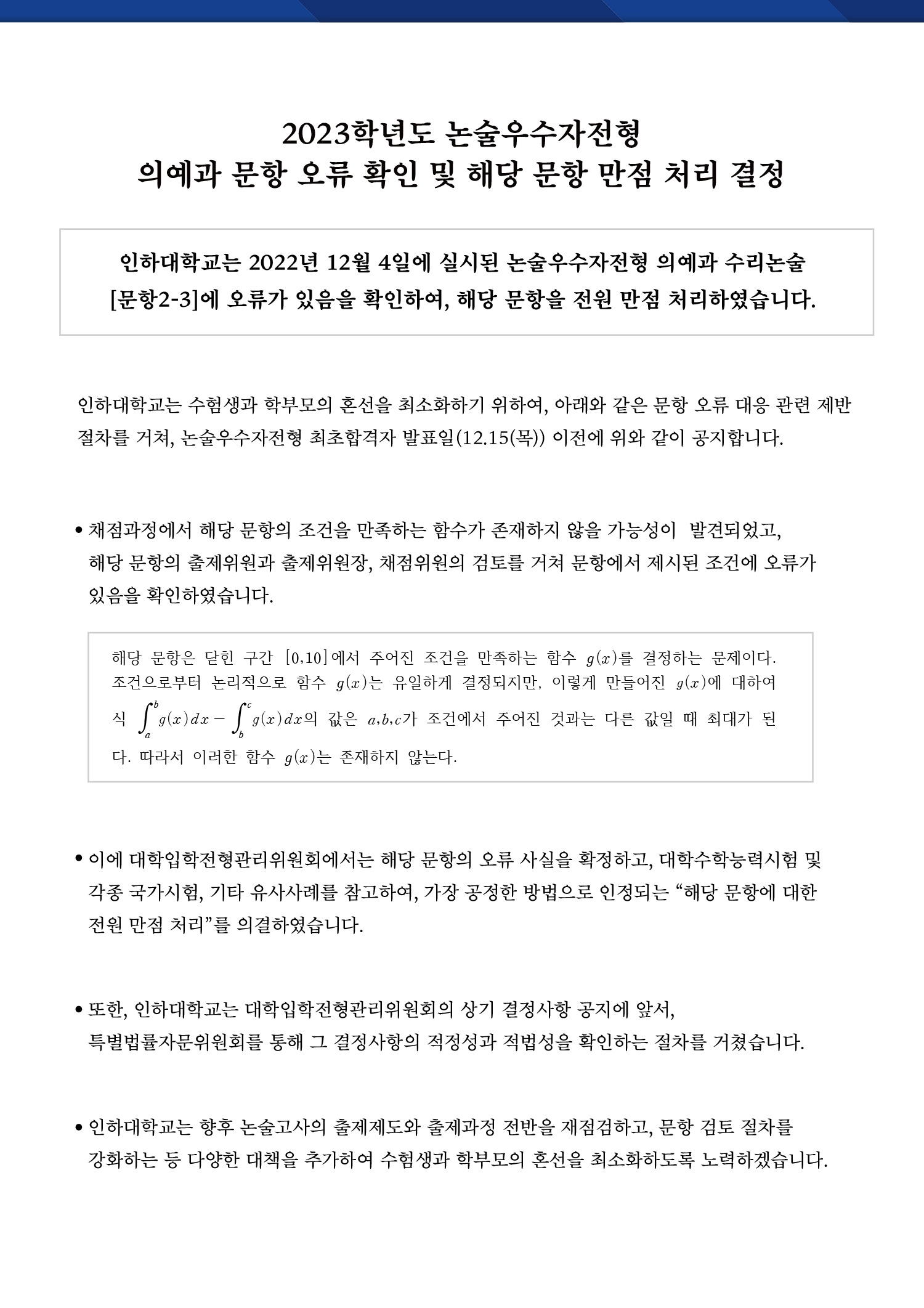 2023학년도 인하대학교 논술우수자전형 의예과 문항 2-3 오류 안내문 2023학년도 인하대학교 논술고사 해설 (자연계열 - 오후)