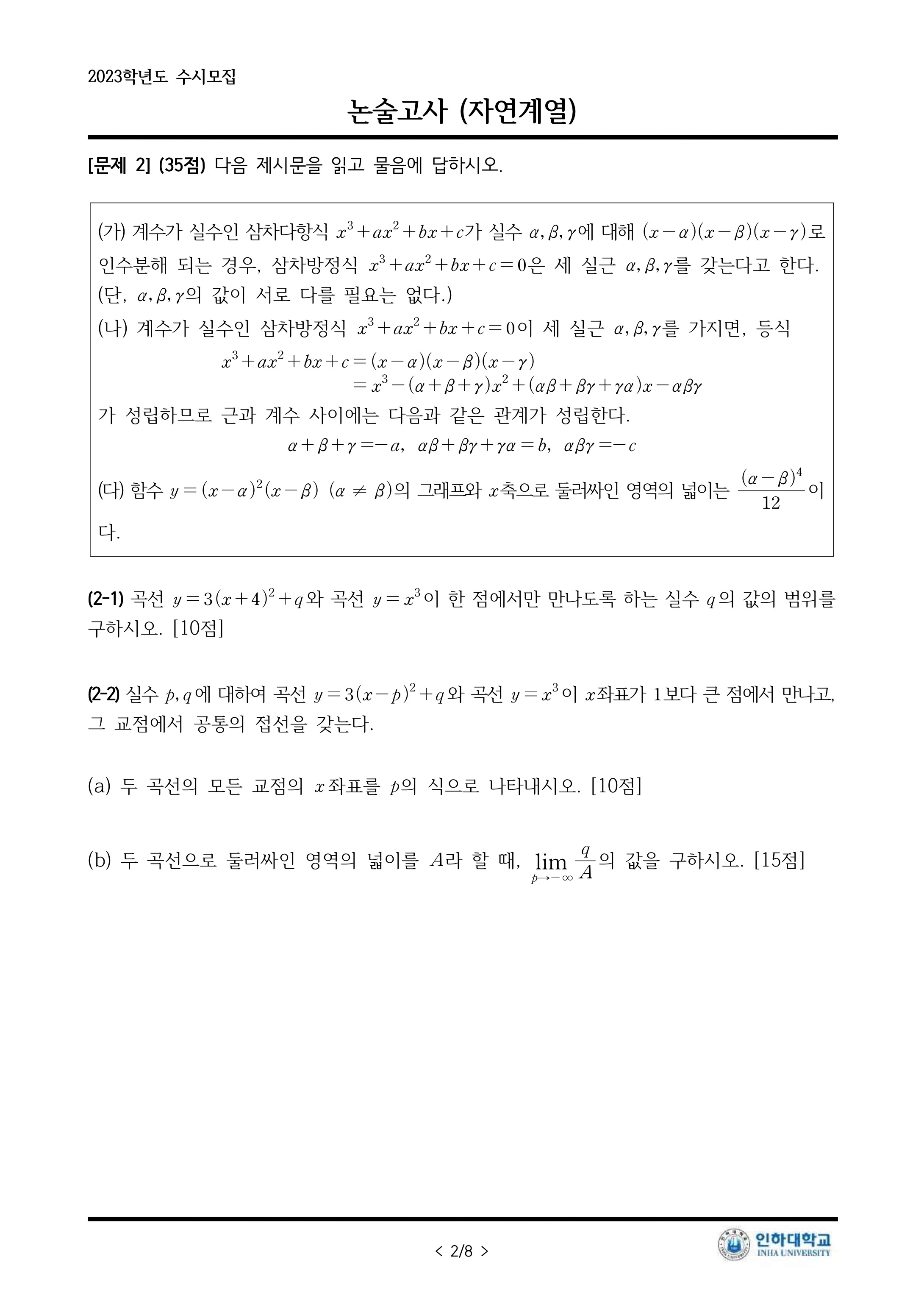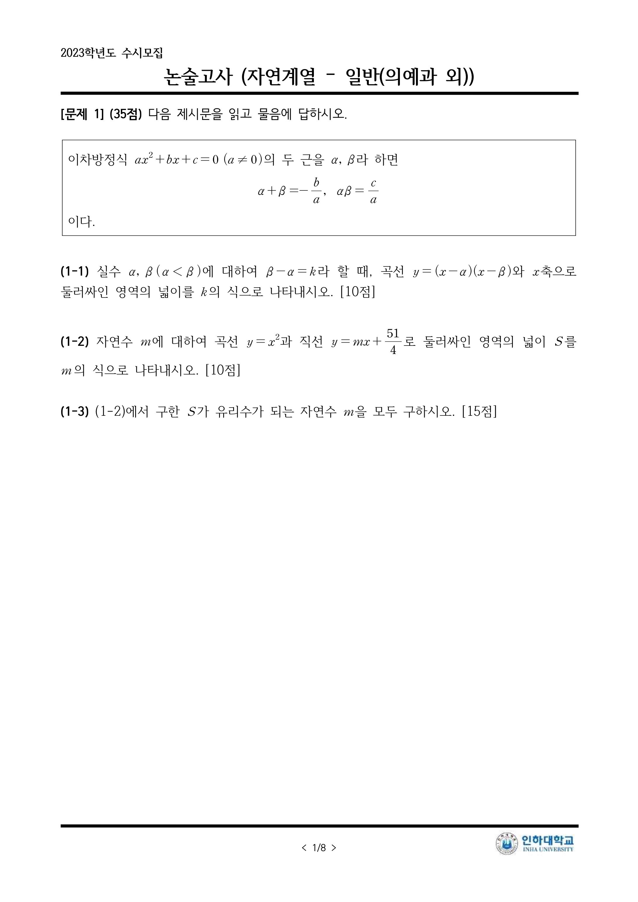 2023학년도 인하대학교 논술 문제 및 해설입시 정보/논술 2023. 8. 15. 16:17