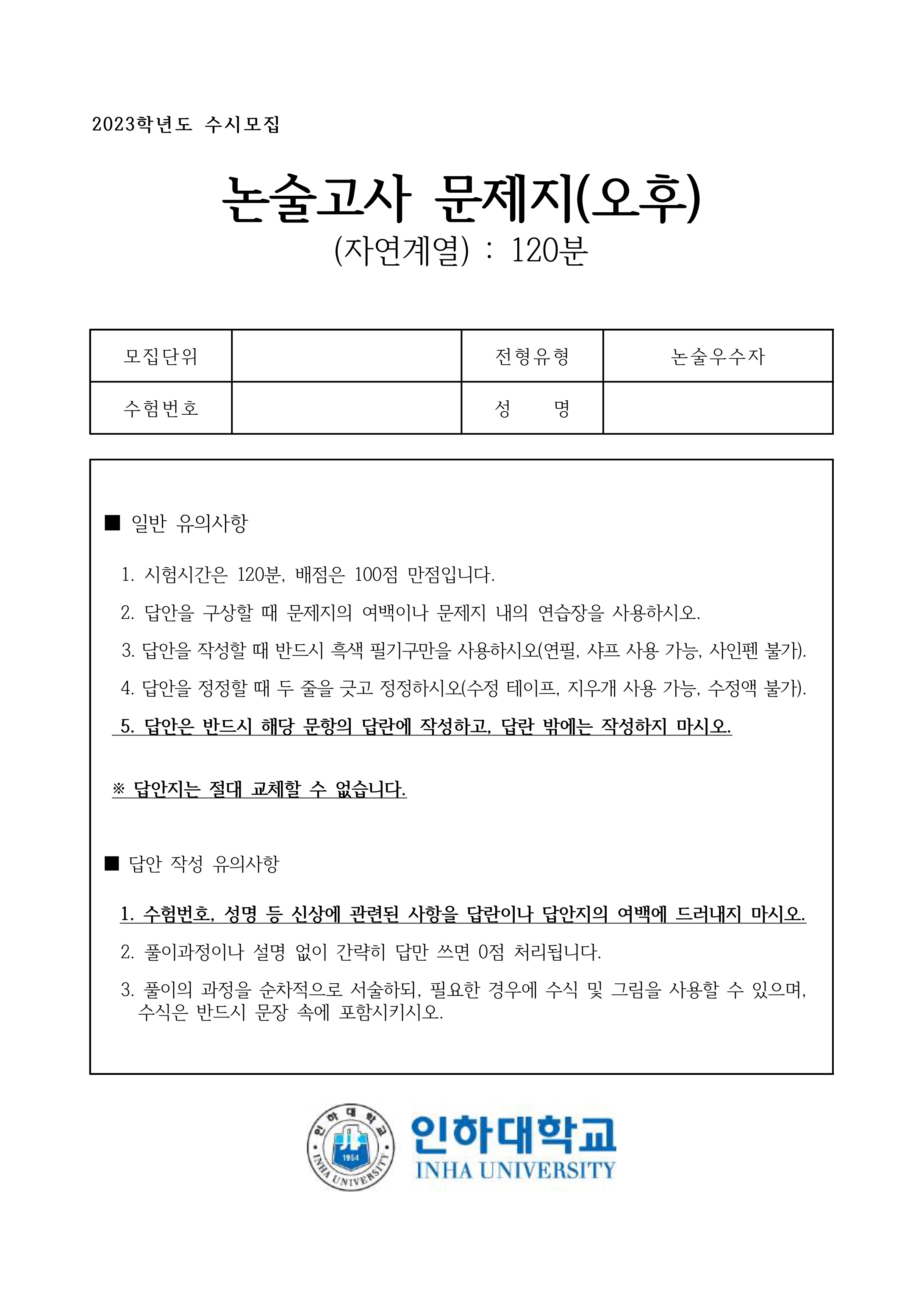 2023학년도 인하대학교 논술고사 문제지 (자연계열 - 오후)