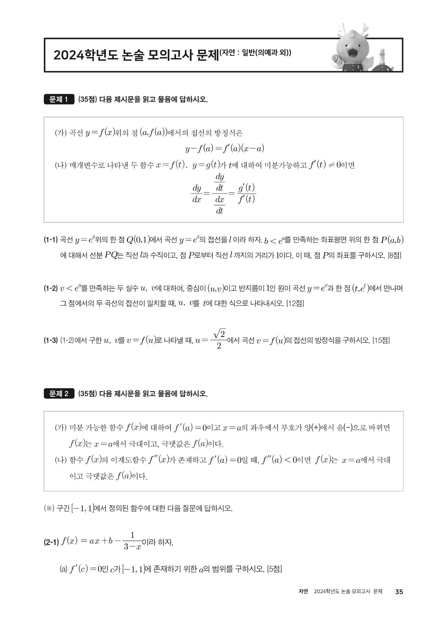 2024학년도 인하대학교 논술 모의고사 문제 (자연계열) 2024학년도 인하대학교 논술 모의고사 문제 (의예과)