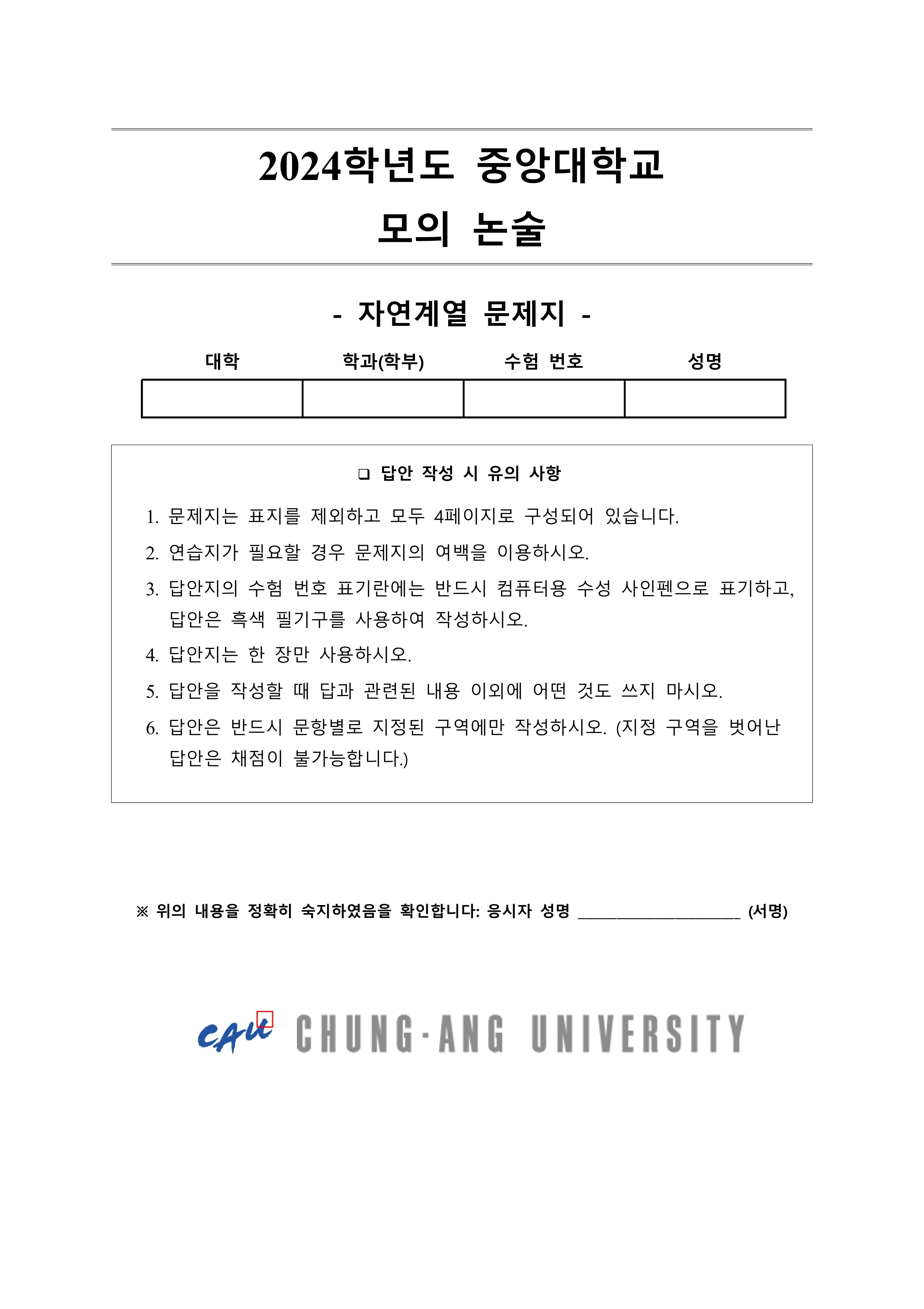 2024학년도 중앙대학교 모의논술 자연계열 문제지