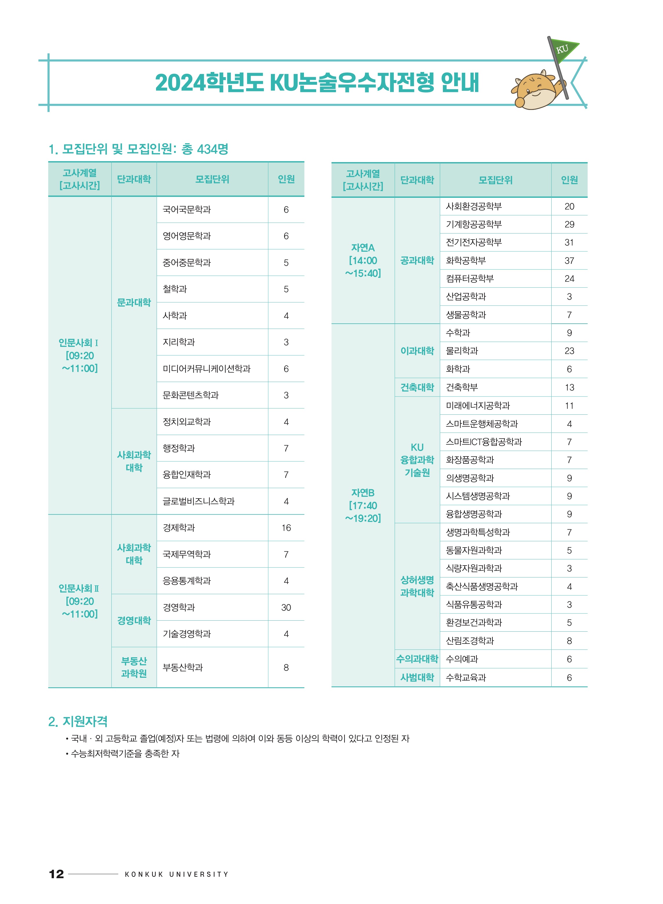 2024학년도 건국대학교 KU논술우수자전형 모집단위 및 모집인원
