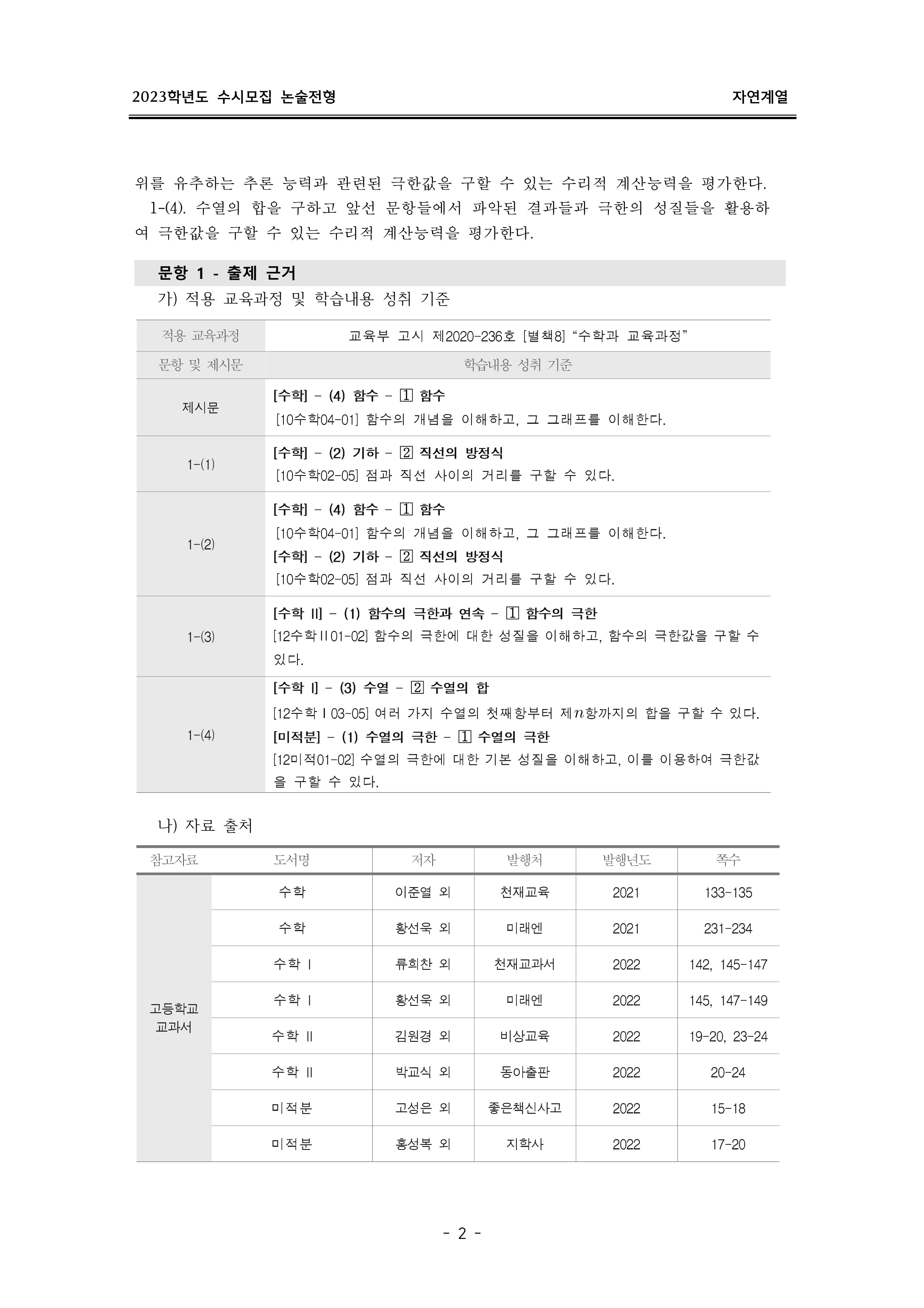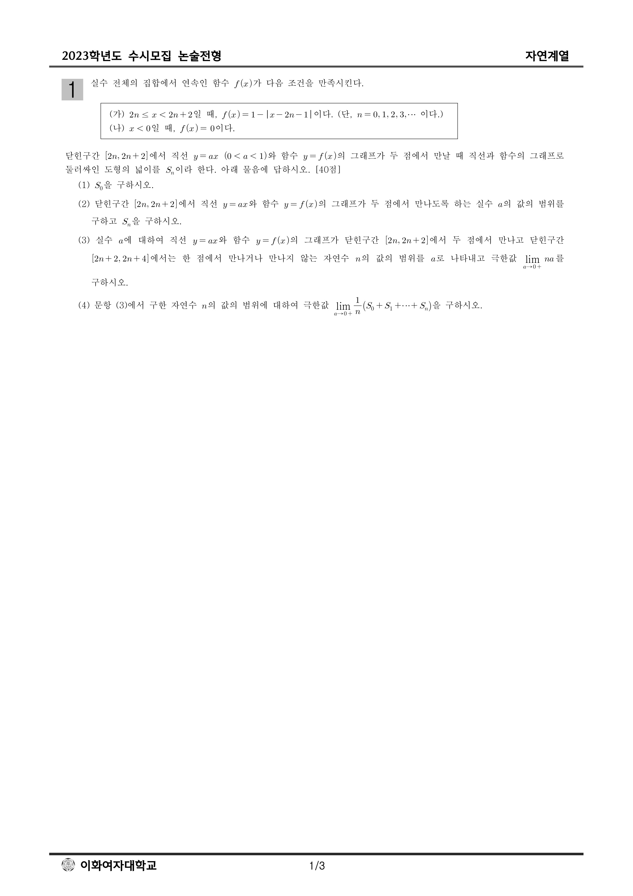 2023학년도 이화여자대학교 논술고사 문제지 (자연계열) 2023학년도 이화여자대학교 논술고사 자연계열_ 문제지.pdf0.34MB2023학년도 이화여자대학교 논술고사 출제 의도 및 답안 (자연계열)