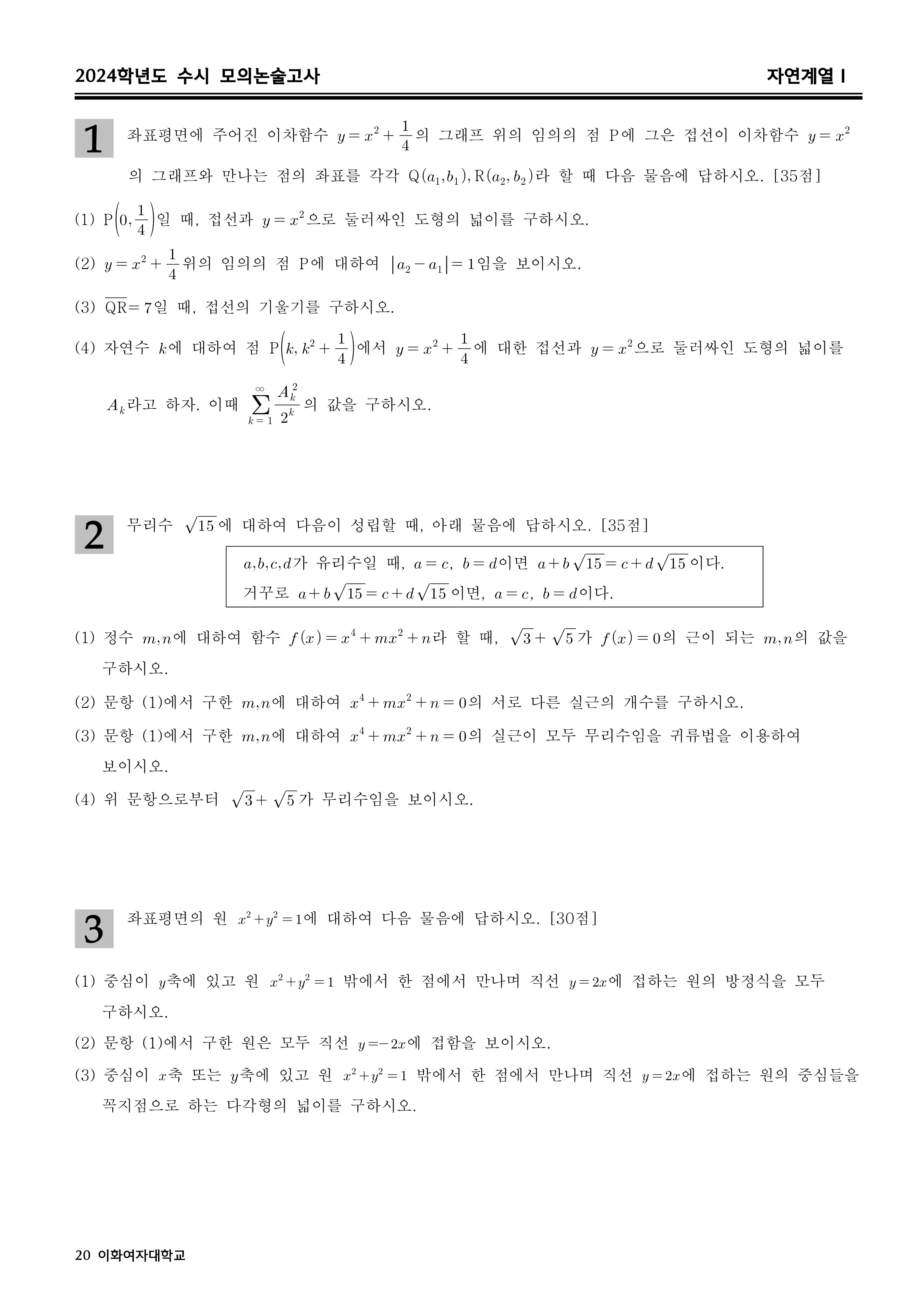 2024학년도 이화여자대학교 모의논술고사 문제지 (자연계열Ⅰ) 2024학년도 이화여자대학교 모의논술고사 문제지 (자연계열Ⅱ)