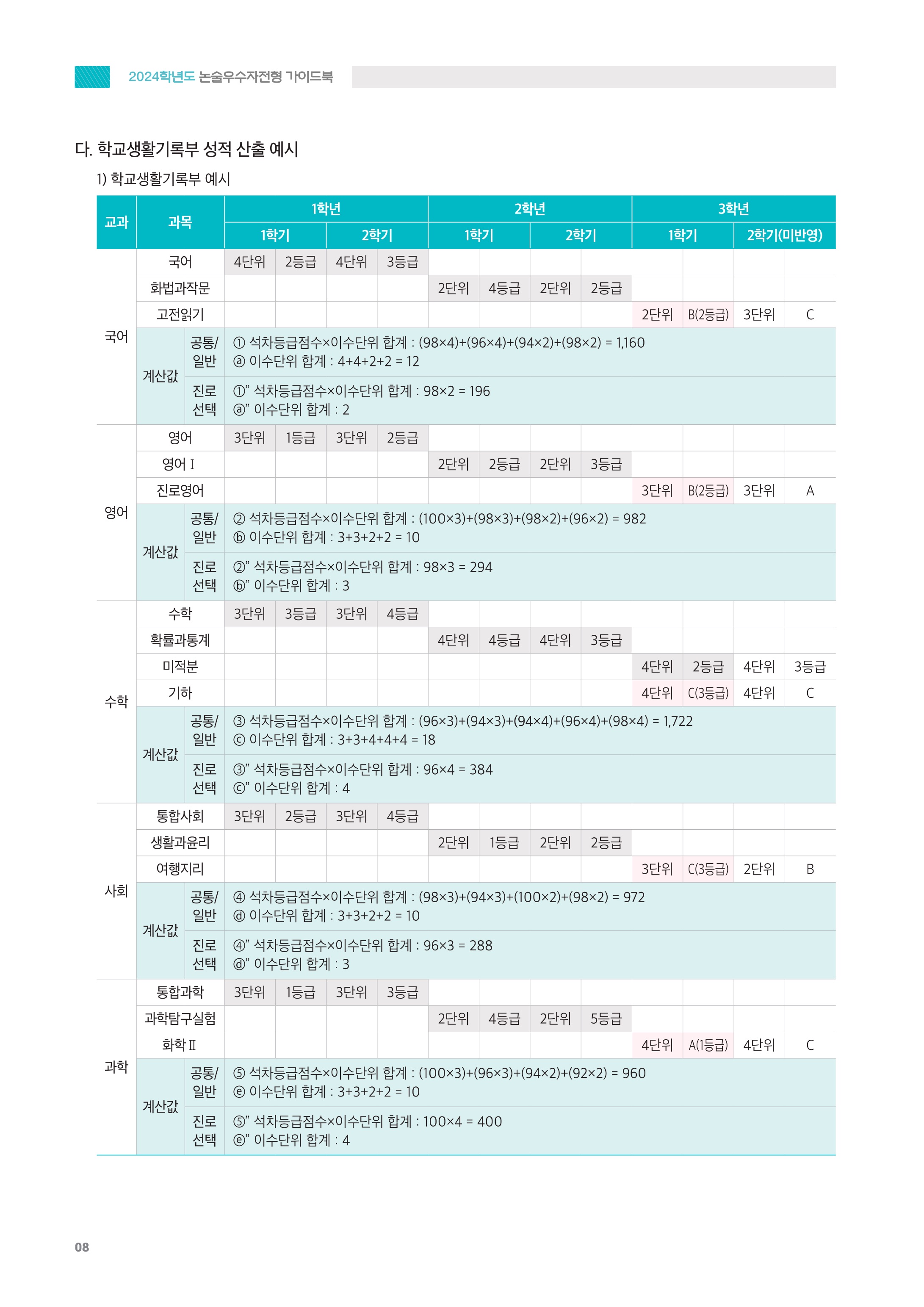 2024학년도 광운대학교 논술우수자전형 학교생활기록부 반영방법