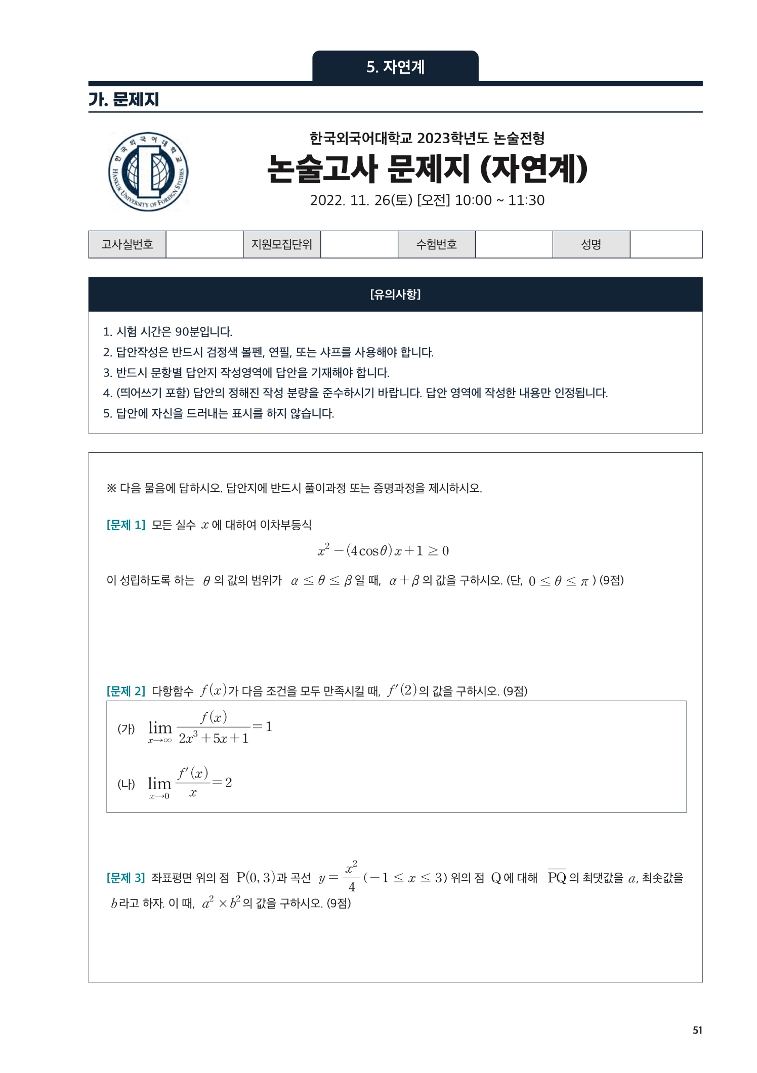 2023학년도 한국외국어대학교 논술전형 논술고사 문제지 (자연계)