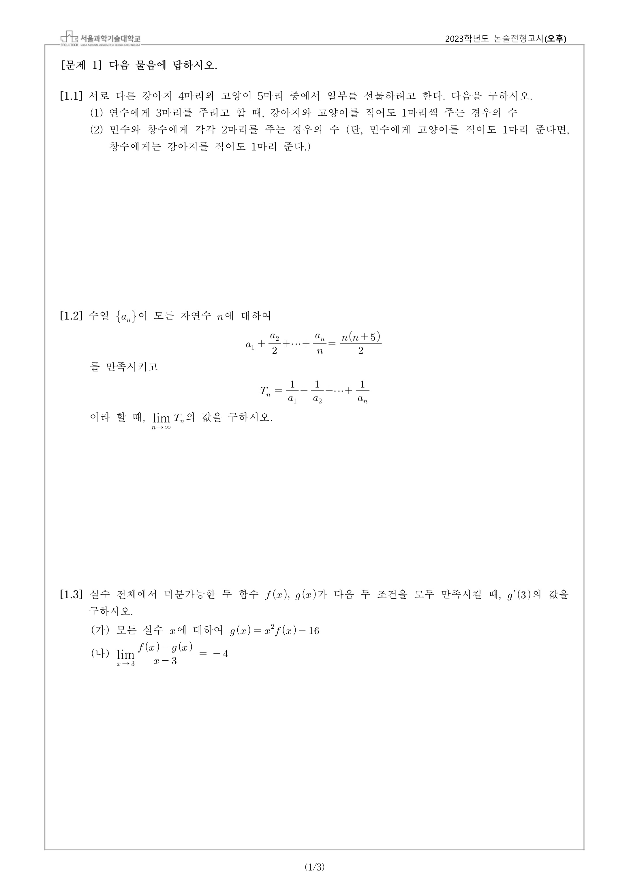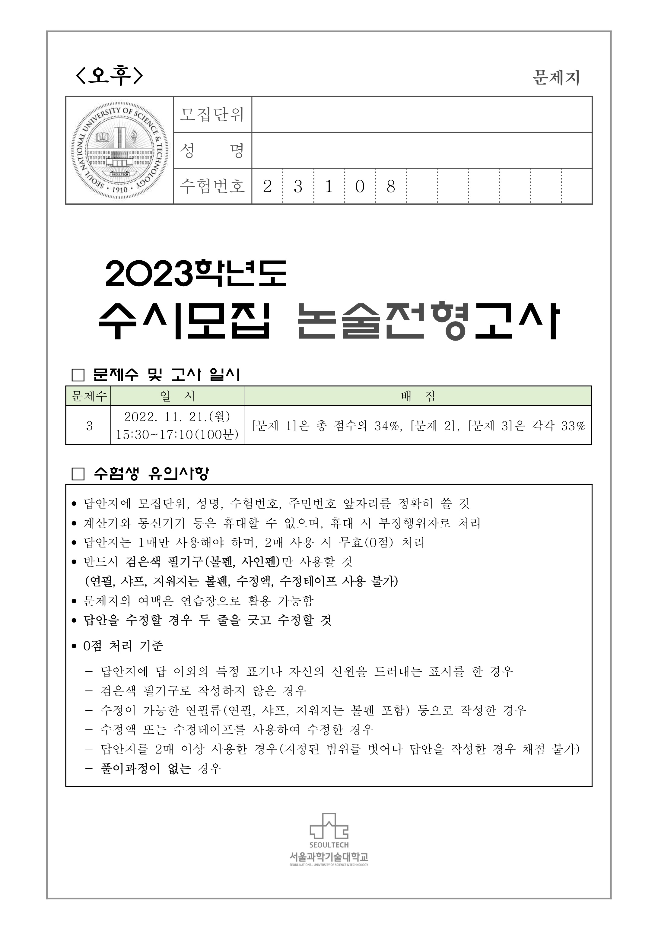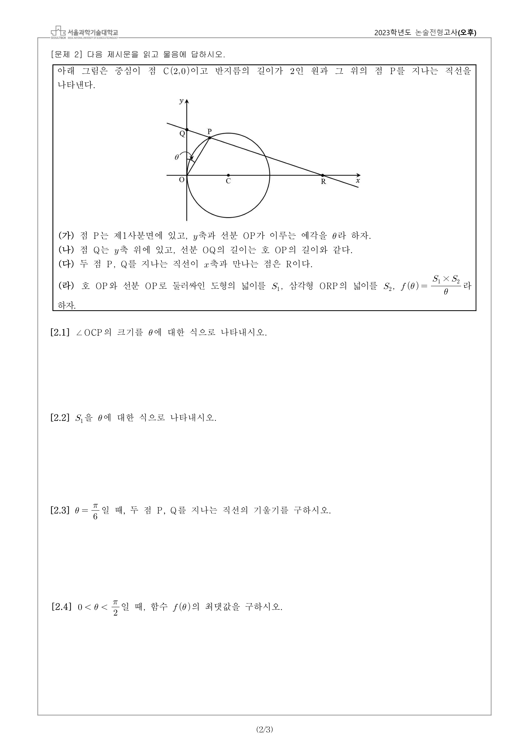 2023학년도 서울과학기술대학교 수시모집 논술전형고사 문제지 - 오후