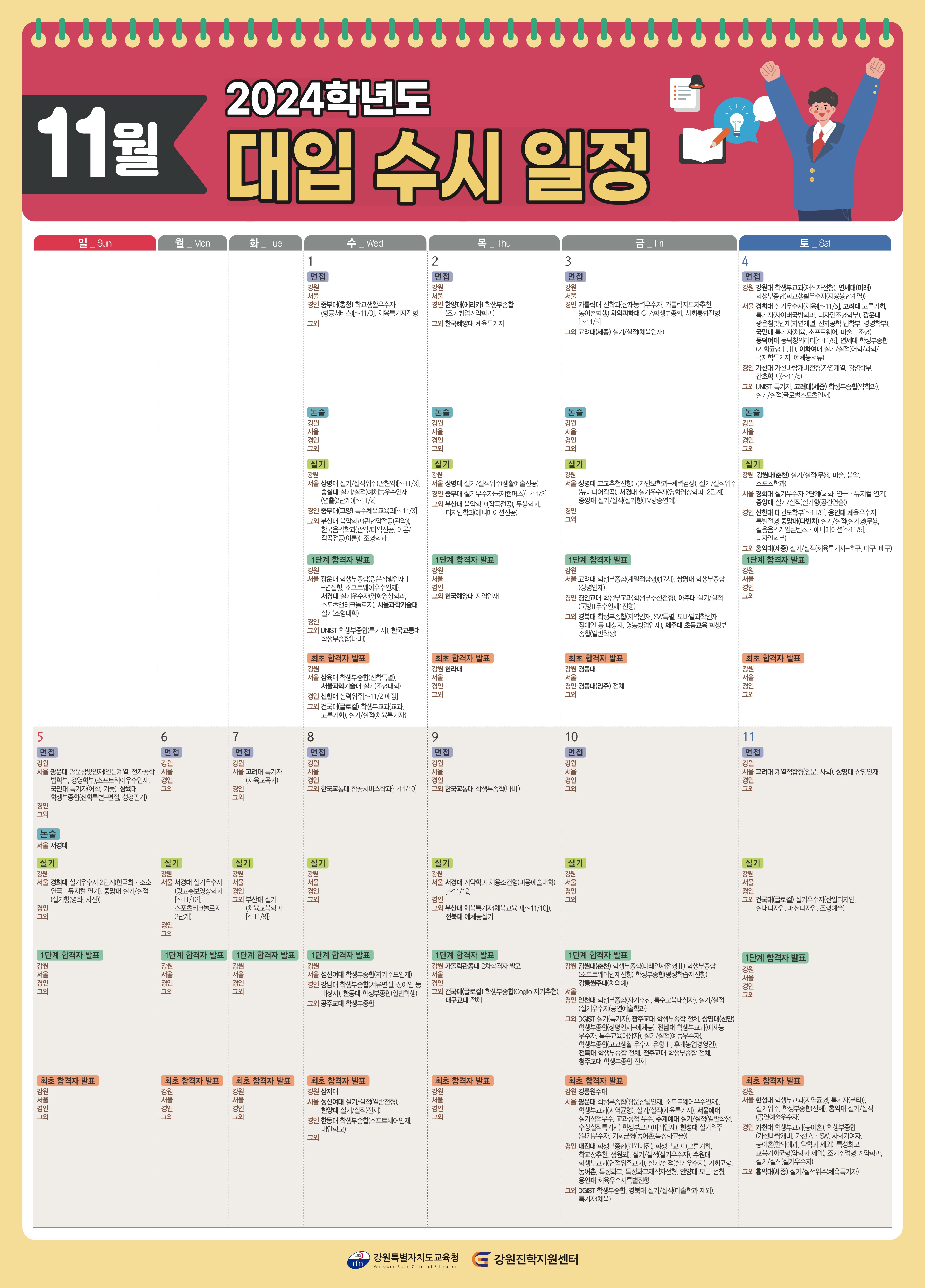 2024학년도 대입 수시 일정 - 11월 횐님들 안녕하세영~~ 이제 수능이 얼마 남지 않았네영. 수시전형에 지원하신 횐님들은 한창 면접과 실기 준비에 바쁘실 거예영. 일정이 너무 많다 보니 날짜나 요일을 헷갈리는 경우도 있는데영, 아래 일정표를 보시고 미리 체크해 두시기 바라영. 11월 일정은 실기, 논술, 면접, 1단계 합격자 발표, 최초합격자 발표 등으로 나뉘어져 있고, 지역은 서울, 경인, 강원, 그외로 분류돼 있어영. 일정이 바뀔 수도 있으니 중요한 일정은 각 대학 홈페이지에서 다시 한 번 확인해 보세영. 글씨가 잘 안 보이는 횐님들은 파일을 다운받으시면 됩니다.🥜