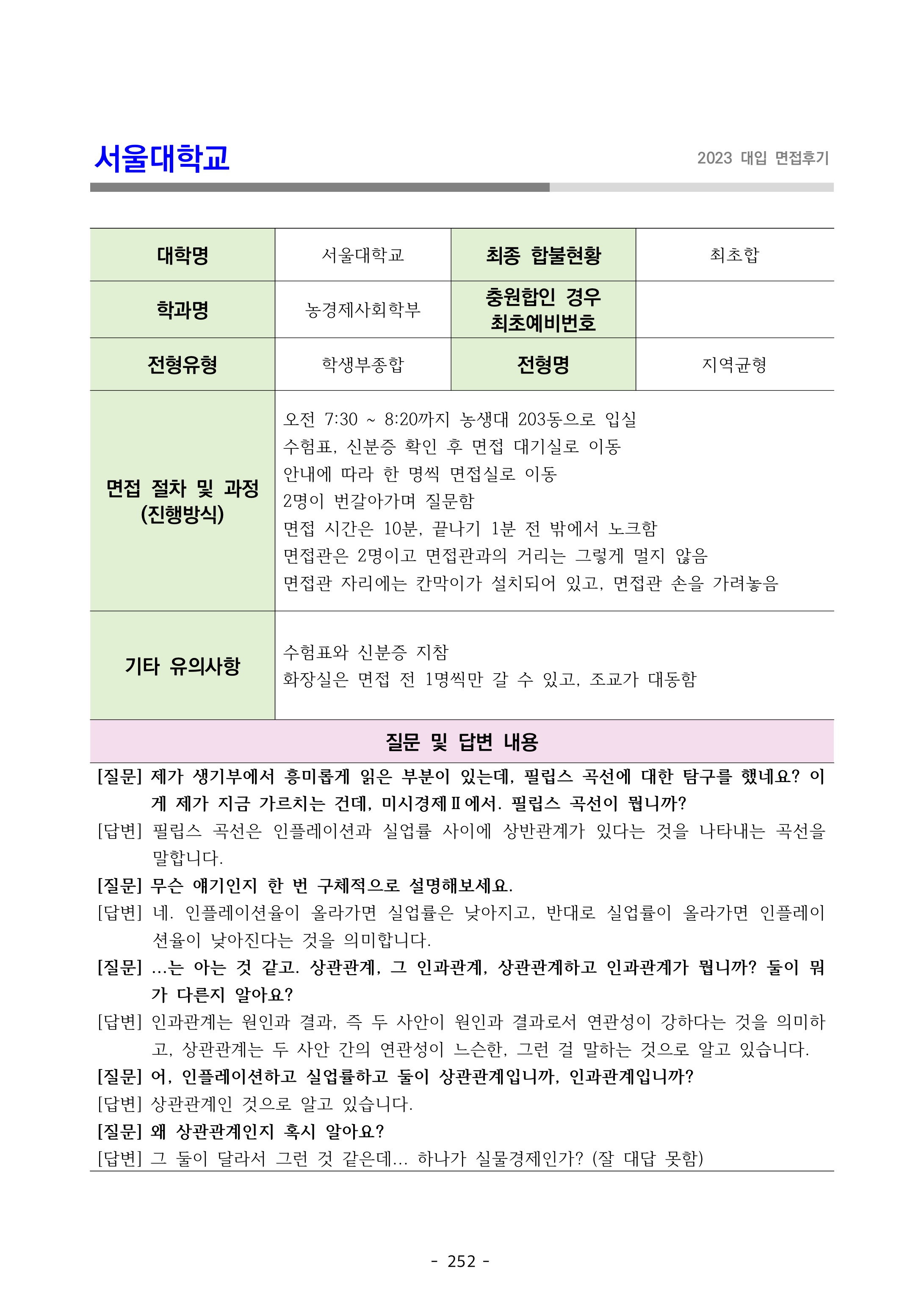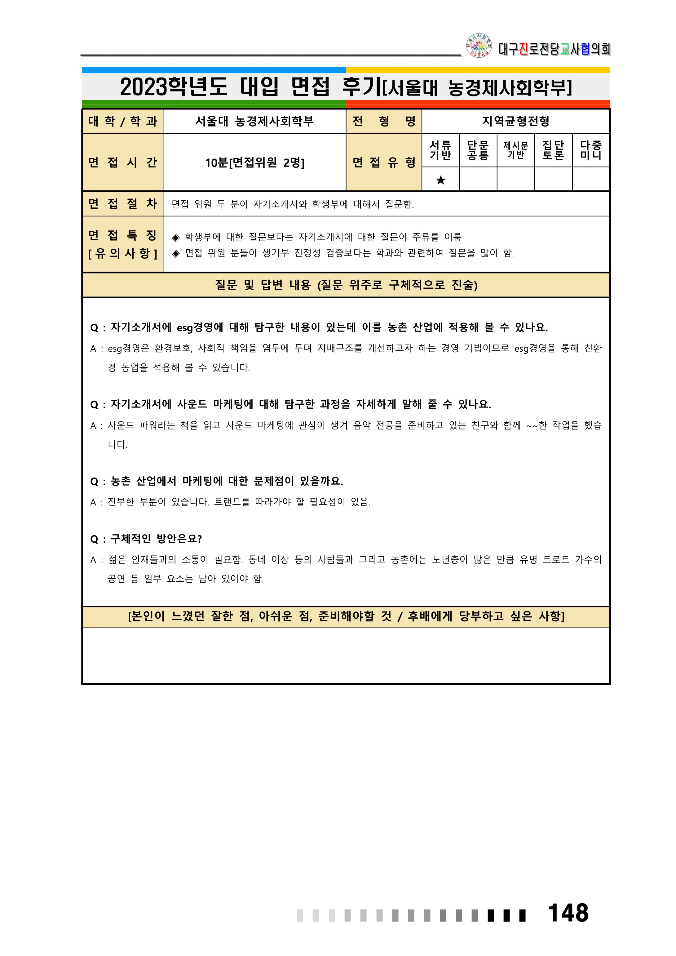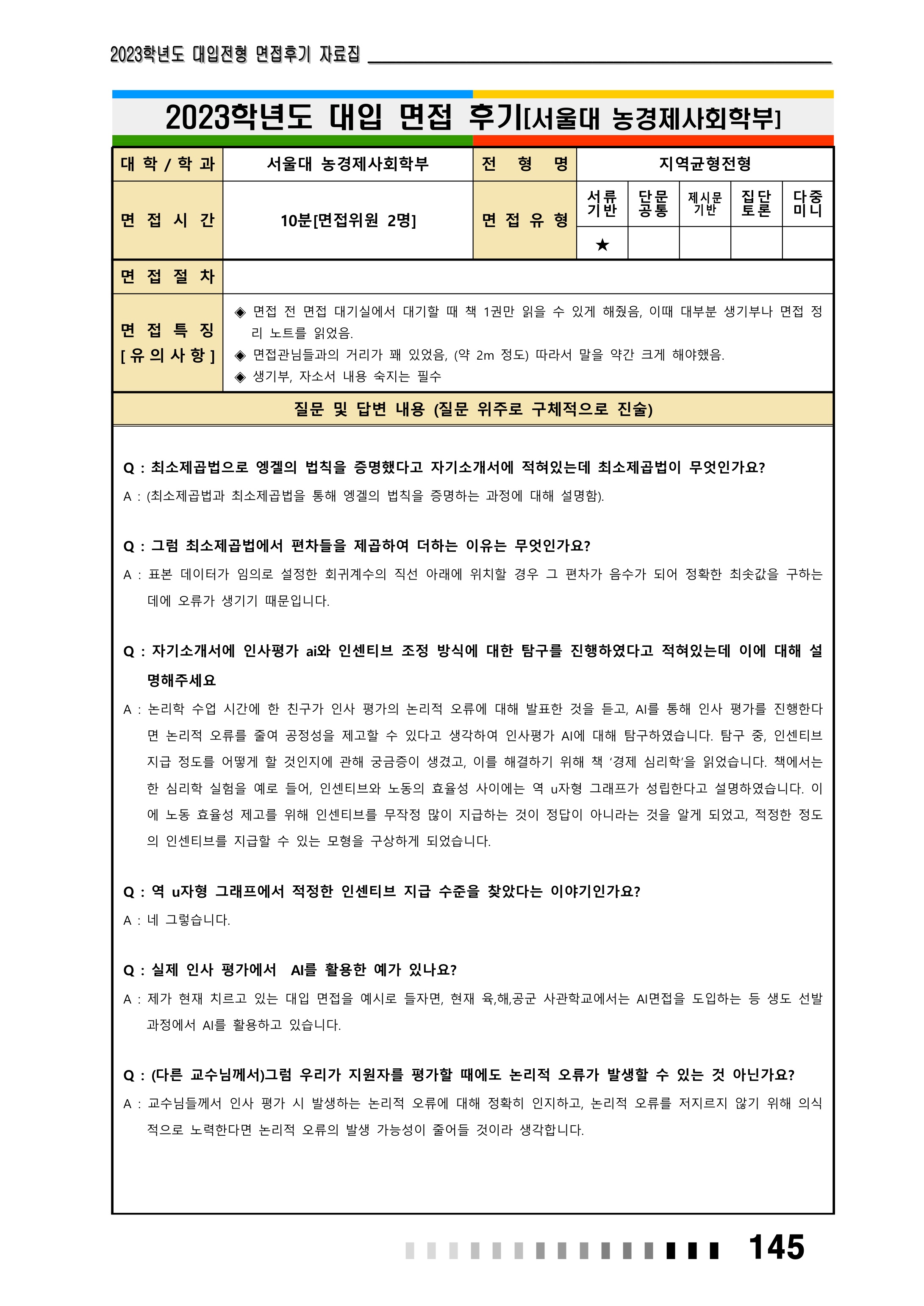 2023학년도 서울대학교 농업생명과학대학 면접 후기5 - 농경제사회학부